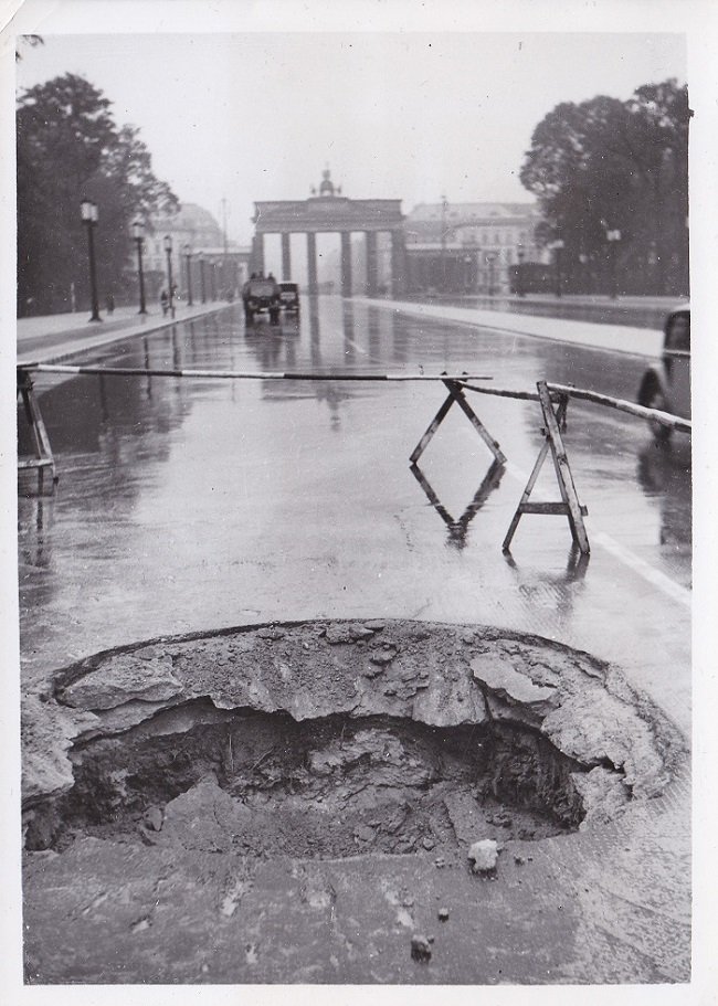 Die Photographie aus dem Jahr 1940 wurde vom deutschen Büro der Associated Press Bild (USA) angefertigt. Sie zeigt einen frischen Bombenkrater nahe dem Brandenburger Tor. Die zeitgenössische Photographie besitzt auf der Rückseite einen montierten Beitext mit folgendem Wortlaut: "Wieder Angriff britischer Flieger bei Nacht auf Berliner Wohnviertel. / In der Nacht vom 10.9.40 zum 11.9.40 griffen britische Flieger die Reichshauptstadt an. Unser Bild zeigt einen Bombentrichter auf der Ost-West-Achse im Tiergarten in Berlin. DER/DAA 56847 11.9.40 ACC". Original-Photographie noch vor dem Eintritt der USA in den Zweiten Weltkrieg!