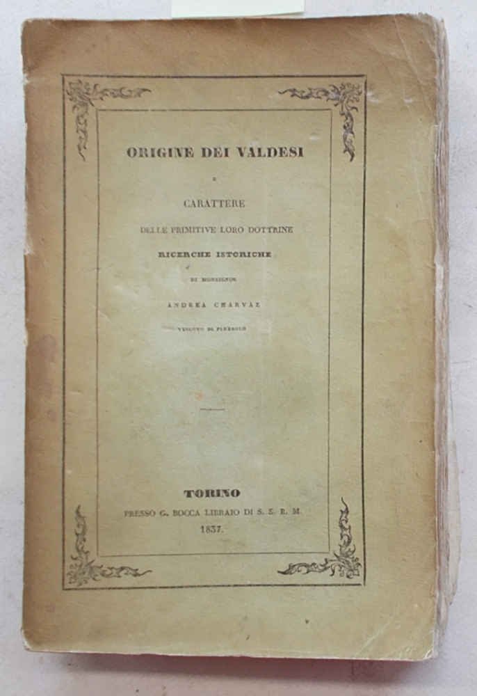 In 8° (cm. 22 x 14); pagg. XXIII, 512, (4); brossura originale con cornice tipografica. Dorso ben rifatto e bruniture, ma esemplare molto buono, a pieni margini. VG-. ** Cfr. Hogon-Gonnet "Bibliografia Valdese", 858. Versione del professor G.F. Muratori fatta su un testo corretto ed accresciuto dall'Autore. L'edizione originale era stata pubblicata a Parigi nel 1836. "Scopo del libro - scrivono Hugon e Gonnet- dimostrare che i Valdesi non sono anteriori a Valdo". Charvaz era stato nominato Vescovo di Pinerolo nel 1834 con l'espresso mandato di convertire e catechizzare i Valdesi.