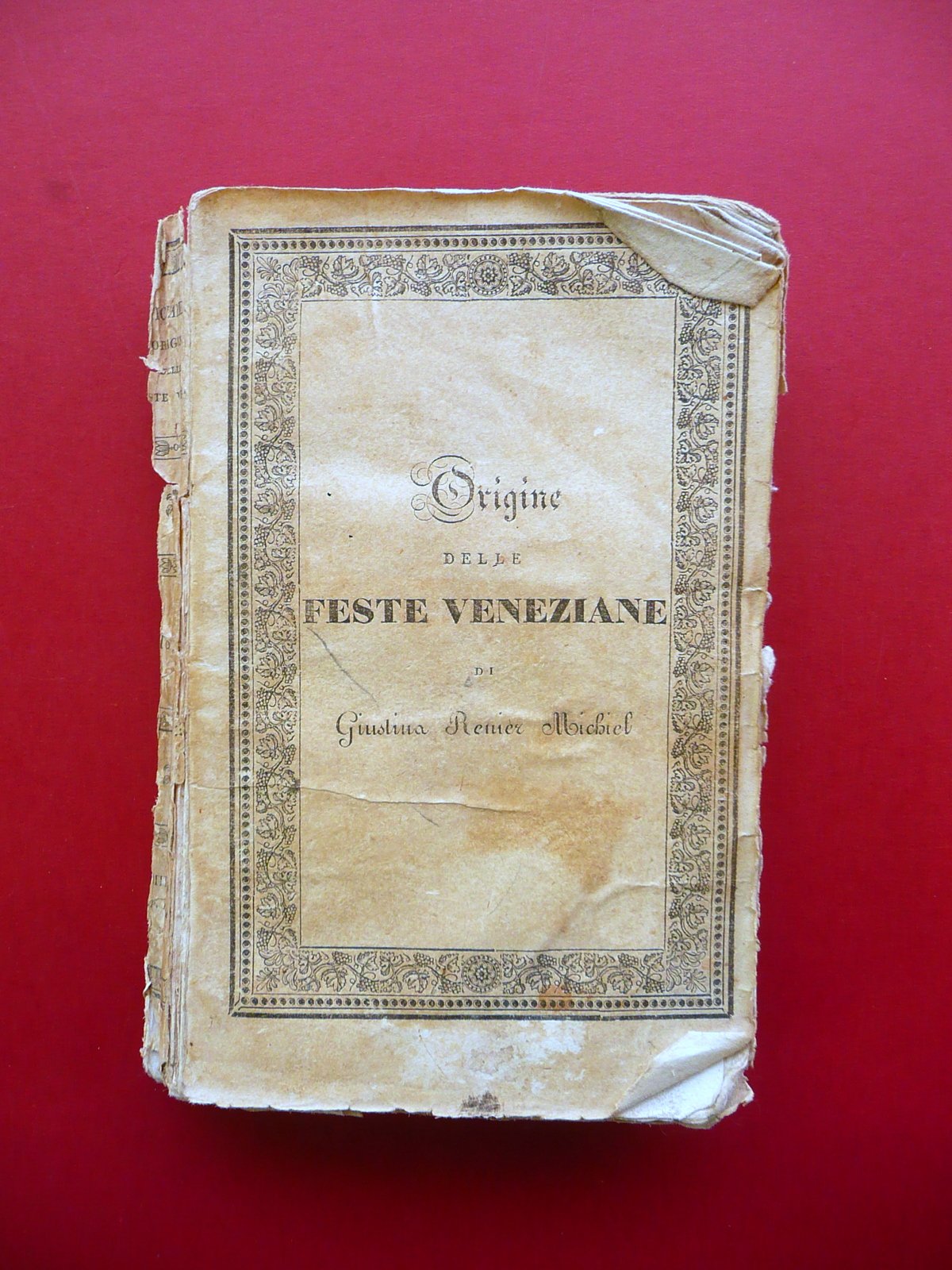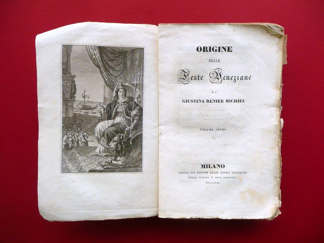 Giustina Renier Michiel, Origine delle feste veneziane volume primo Presso gli Ed. degli Annali Universali delle Scienze, Lettere e Industria, Milano 1829; cm 17x10,5; pp. XXXVIII-210, pi√π una tavola incisa in b/n all'antiporta. Brossura ed. d'attesa. Seconda di copertina con applicato ex libris del precedente proprietario. Volume primo. Condizioni di conservazione Esemplare in condizioni discrete con tracce d'uso, alcune piccole leggere bruniture e aloni; margini e angoli delle brossure con qualche piccola / minima mancanza e strappetto; dorso fessurato con strappetti anche di alcuni cm, con conseguente lieve allentamento delle cuciture. Interni buoni con qualche piccola lieve brunitura; parte inf. delle pp. 115-210 con lieve ombra di gora che non compromette la lettura del testo (vedi foto). Pp. XXVII-XXX staccate dal corpo del testo. Solo volume primo. SETT11.L19141 N P