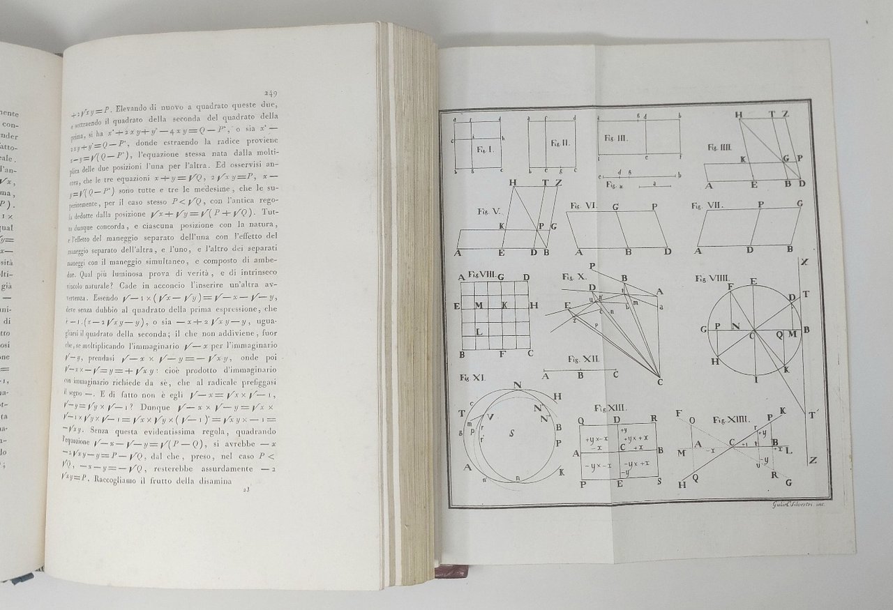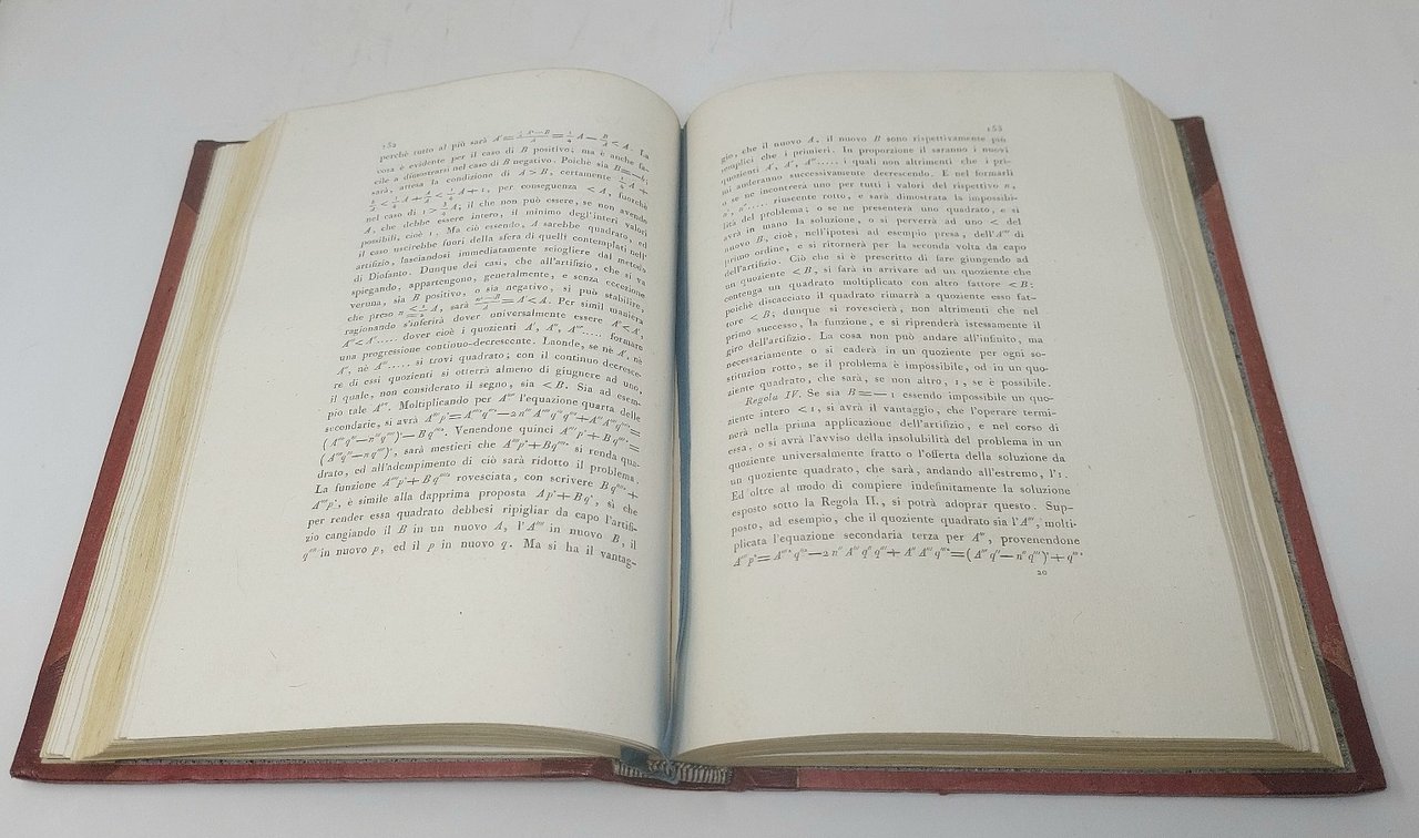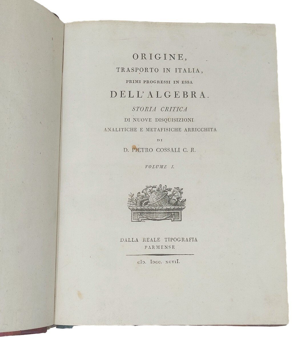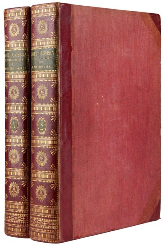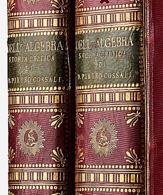 >2 volumi in-4 (284x205 mm), pp. (24),396+(4); pp. (12), 492, (4), con 2 tavole incise da G. Silvestri ripiegate. Raffinate legature del migliore legatore austriaco del tempo, Georg Friedrich Krauss, realizzate per Albert di Sachsen-Teschen (1738-1822), in mezzo marocchino rosso e angoli, con suo monogramma “AST” ripetuto quattro volte ai dorsi e due tasselli verdi. Figlio di Friedrich August II di Sassonia e genero dell'Imperatore Francesco I, dopo una brillante carriera militare e diplomatica Albert von Sachsen si ritirò a Vienna nel 1795 per dedicarsi al collezionismo e all'arte. Ebbe come consiglieri Giacomo Durazzo e Adam von Bartsch, il massimo esperto dell'arte grafica, ed il suo palazzo e la sua collezione costituirono le basi per la formazione di quella che sarebbe diventata nel 1921 la celebre Albertina. Prima e unica edizione di questo testo di grande importanza per la storia delle matematiche in Italia, uscito dai torchi bodoniani in un periodo assai turbato dagli eventi militari e rivoluzionari, e che pertanto non ebbe all'epoca l'attenzione adeguata; il che ne spiega anche la notevole rarità. Cossali fu noto storico della matematica, nominato da Napoleone alla cattedra di Padova. La sua opera , che dimostra l'originalità del contributo dei matematici italiani del tardo Medioevo, fu uno dei pochissimi libri scientifici stampati da Giambattista Bodoni. Perfetto esemplare, in legatura d'eccezione (molto fresco, tagli gialli e segnalibri in seta azzurra, sulle sguardie ex libris della famiglia Antinori e timbro privato).
