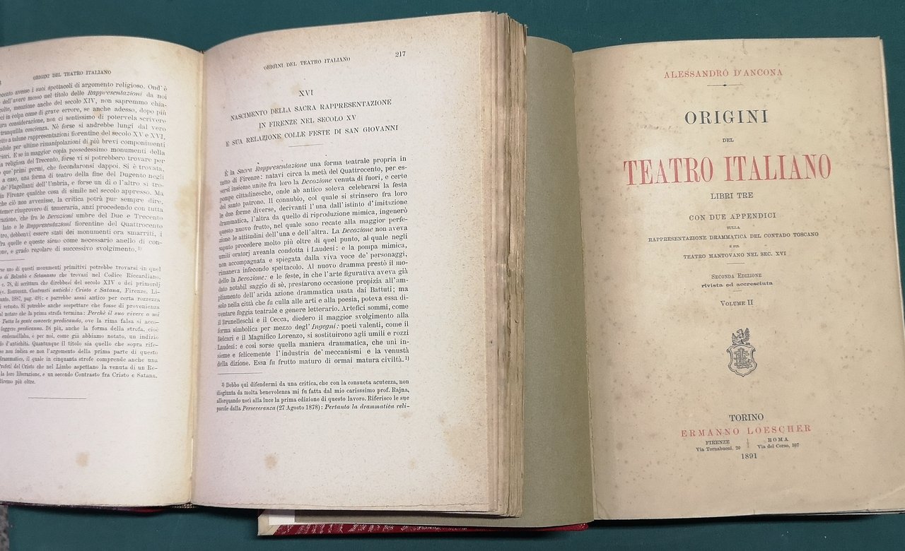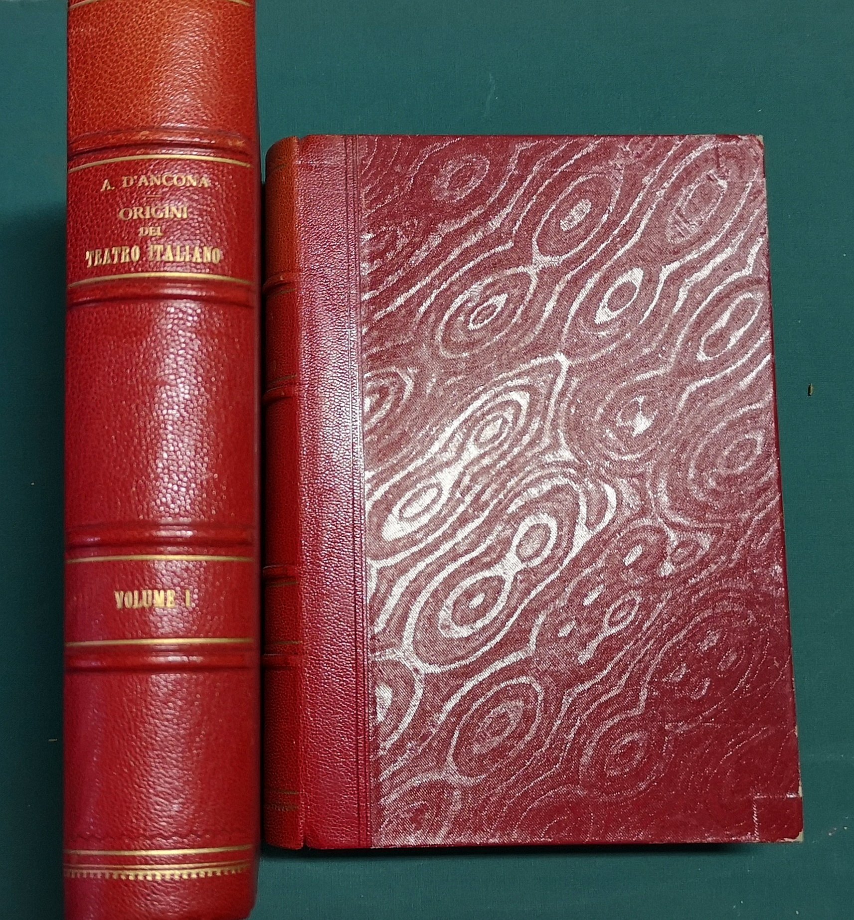 >2 vol. in-8, pp. (6), 670, (2) ; (4), 626, (2); ben leg. m. pelle, tit.oro al dorso a nervi, cop. edit. cons. Testo fondamentale sul teatro alle sue origini, dalle Laude alle sacre rappresentazioni ai drammi profani; con due appendici locali di estremo interesse; il tutto supportato da ricerche su esaustive basi documentarie. Edizione di gran lunga preferibile alla prima, assai ricercata. Ottimo esempl. (malgrado lievi fioriture).