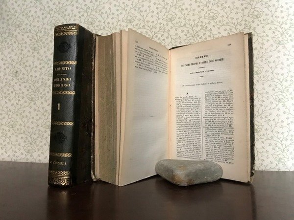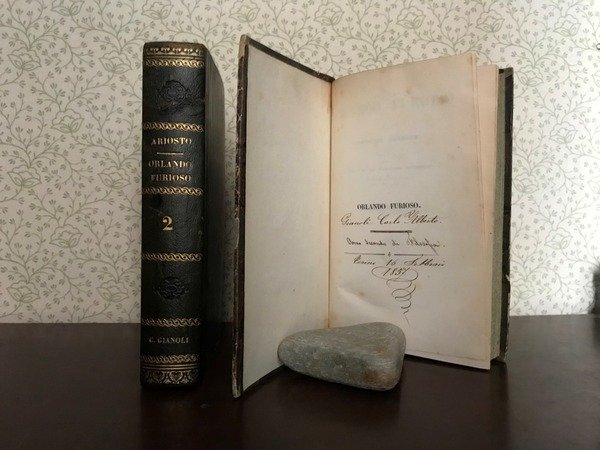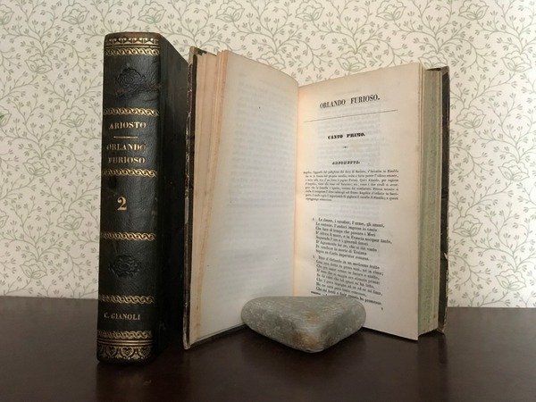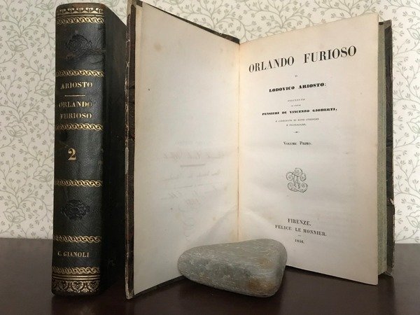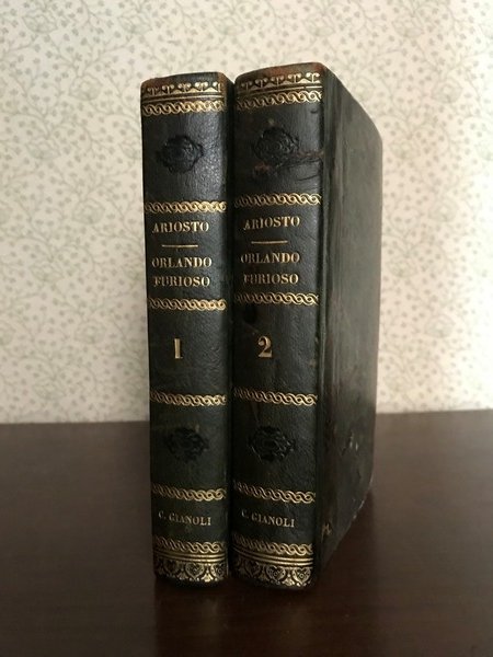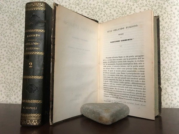 Opera in due volumi in 8, elegante legatura coeva in mezza pelle verde, titolo al dorso ornato, impresso a secco e decorato in oro, piatti marmorizzati, tagli spruzzati, sguardie con ex-libris della biblioteca scientifica di Carlo Alberto Gianoli, novarese, storico, architetto, nonch rinomato produttore di vini. Occhielli con firma di propriet dello stesso, frontespizi, XXIII pp., de' Pensieri del Gioberti, 513, 573 pp., errata, bianche finali. Inedita veste per uno dei maggiori capolavori della nostra letteratura, presentato in un'elegante edizione, completa con note e annotazioni sul testo. Lo stato di conservazione ottimo, affascinante per gli amanti del genere ' Le donne, i cavalier, l'arme, gli amori'.