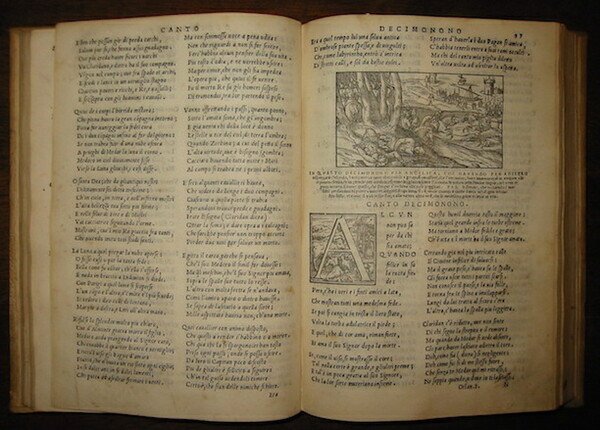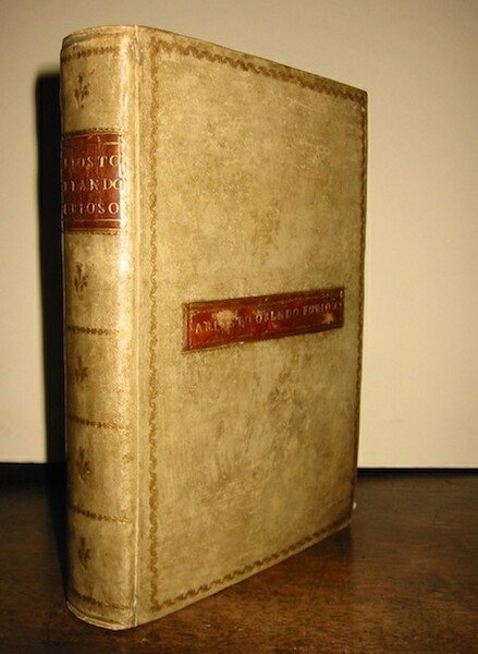 8vo (cm. 20,7), 260 cc., 20 cc. con proprio frontespizio che contengono ‘Espositione di tutti i vocaboli et luoghi difficili. raccolte da M. Lodovico Dolce’. Frontespizio entro ricca cornice allegorica. Iniziali istoriate e vignette xilografiche all’inizio di ciascun canto. Ritratto dell’Ariosto entro ovale al verso di c. 260. Marca editoriale al verso dell’ultima carta. Testo su due colonne. Legatura settecentesca in pergamena rigida con fili, fregi e titolo oro su tassello in pelle rossa al ds. Cornici dorate ai piatti e altro tassello con autore e titolo al piatto anteriore. Frontespizio rinforzato e con piccole lacune marginali. Occasionali macchioline e sporadici percorsi di tarlo che non interessano il testo. Un taglio senza alcuna perdita a c. 127. Ultima carta allentata. Nel complesso, esemplare genuino ed in più che buono stato di conservazione. Rarissima prima edizione pubblicata dal Giolito, dai cui torchi uscirono negli anni successivi oltre venti ristampe. Bongi I, pp. 43-47; Br. Libr., p. 39; Gamba, 53. Non in Adams.
