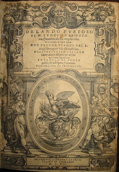 Orlando furioso di M. Ludovico Ariosto nuovamente alla sua integrità ridotto e ornato di varie figure. Con alcune Stanze del S. Aluigi Gonzaga in lode del medesimo. Aggiuntovi per ciascun Canto alcune allegorie & nel fine una breve espositione et tavola di tutto quello, che nell’opera si contiene