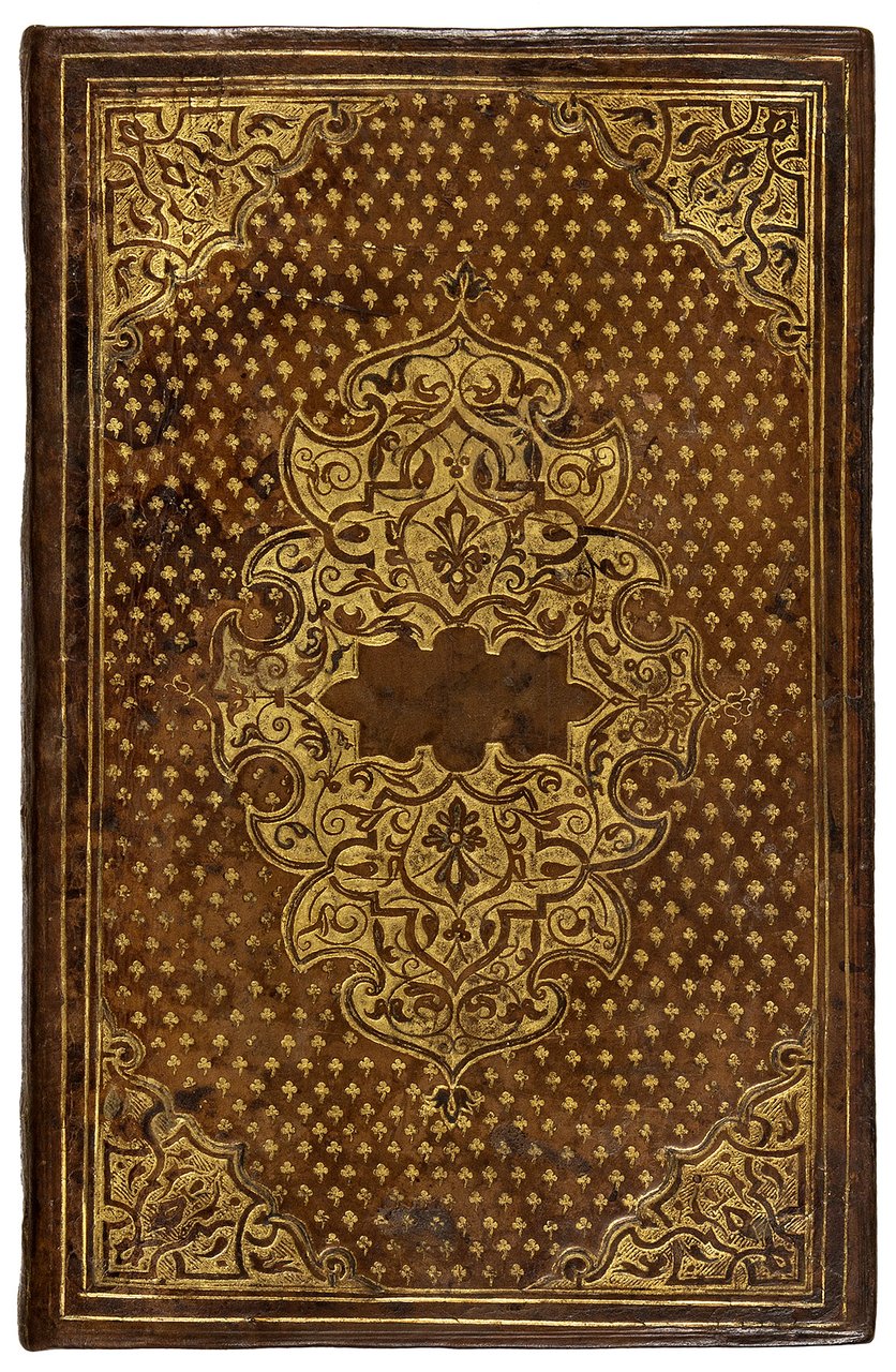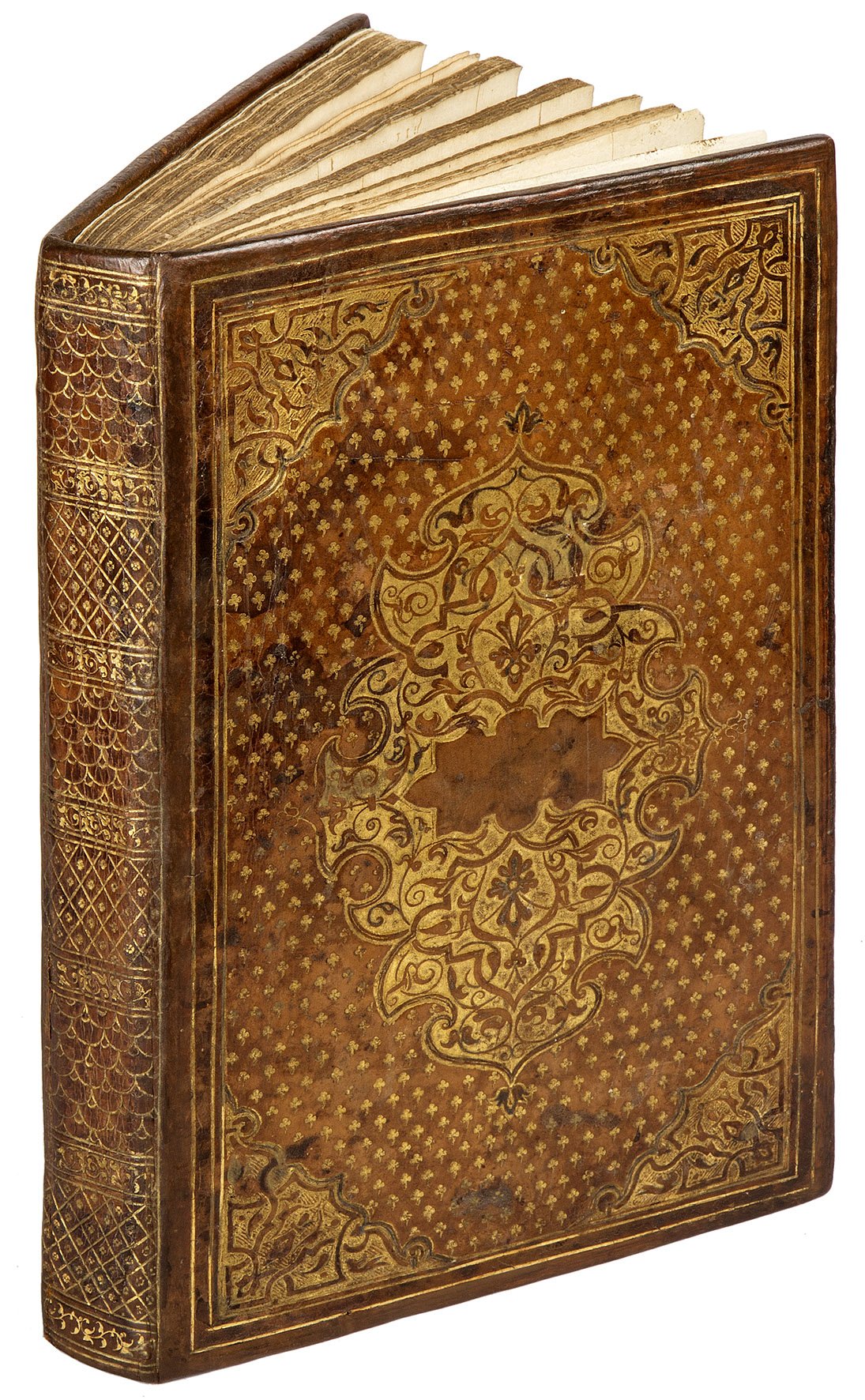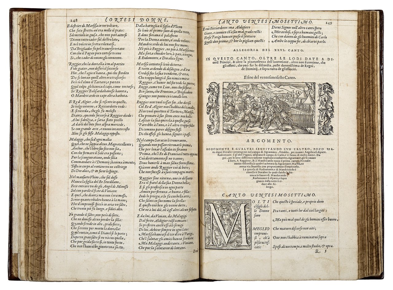 4to (249x156 mm). 508, [44] pp. Collation: A-Z8 Aa-Ll8 Mm4. Printer's device on title page and ll. Ff1r, Kk1r, and Mm4r. Leaf Ii8 is a blank. Colophon on l. Ii7v. Text printed in two columns, italic and roman type. With a woodcut architectural title page, numerous decorated initials, and 52 woodcut vignettes printed at the beginning of every book of the poem and the final stanza. On l. Ff1r Gli Cinque canti opens with a separate title page; on l. Kk1r Le sposizione di tutti i vocaboli […] raccolte da M. Lodovico Dolce begins, likewise with a separate title page. Contemporary Lyonnaise binding in richly gilt-tooled light brown morocco, flat spine, panels with large gilt-stamped centre- and corner-pieces, gilt and gauffered edges (skillfully restored, lower joint slightly cracked). On l. A2r the ownership inscription “Juris Consulti D. Joseph Lishri [?]”; on the last back flyleaf the manuscript note “Respize”. Upper margin of l. Ff1 repaired, some staining, slightly and uniformly browned, small round wormhole to the lower margin in the first half of the volume, not affecting the text. A good copy ruled in red throughout. Preserved in a cloth box.