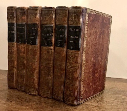 32mo (cm. 10,5), 6 Voll.; XXXI-146 pp.; 2 cc.nn., 210 pp.; 2 cc.nn., 252 pp.; 2 cc.nn., 227(1) pp.; 2 cc.nn., 207(1) pp.; 2 cc.nn., 220 pp. Attraenti legature coeve in piena pelle con ricchi fregi e titoli impressi in oro su tassello al ds. Cornici dorate ai piatti. Tagli e carte di guardia marmorizzati. Piccola macchia d’inchiostro al margine bianco delle pp. 107-108 nel primo vol., assenza della carta di guardia libera posteriore nel secondo e mancanza all’occhietto nel quarto. Nel complesso, esemplare in ottimo stato di conservazione di questa non comune edizione in piccolo formato. Cfr. Agnelli-Ravegnani, Annali delle edizioni ariostee, I, pp. 217-218.
