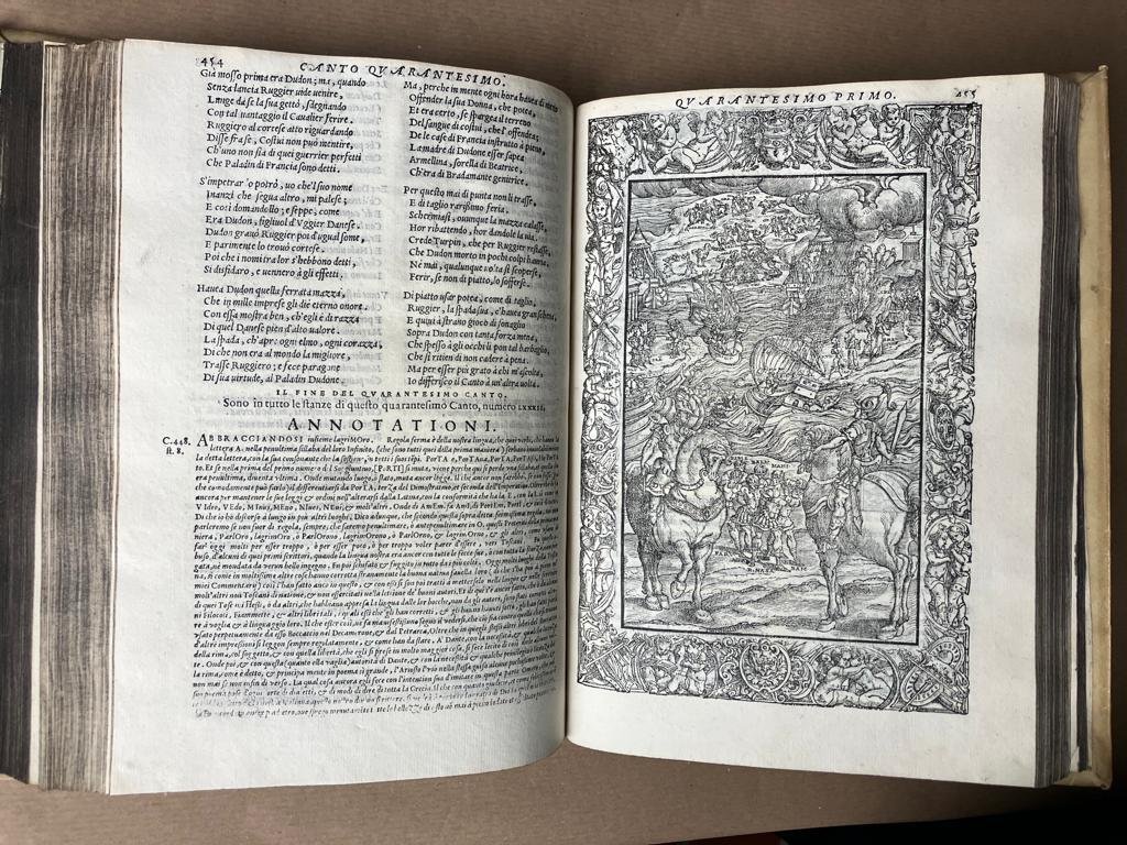 Rare first Valgrisi edition followed by numerous others. "Première édition donneé par les Valgrise, et la plus estimée de toutes" (Graesse). Specimen of the in-quarto editions without the "Cinque canti", which appeared simultaneously with the Octavo edition. The commentary by Girolamo Ruscelli (1500-1566) in the appendix with its own title page. With the beautiful sheet-sized woodcuts based on the drawing by Dosso Dossi.