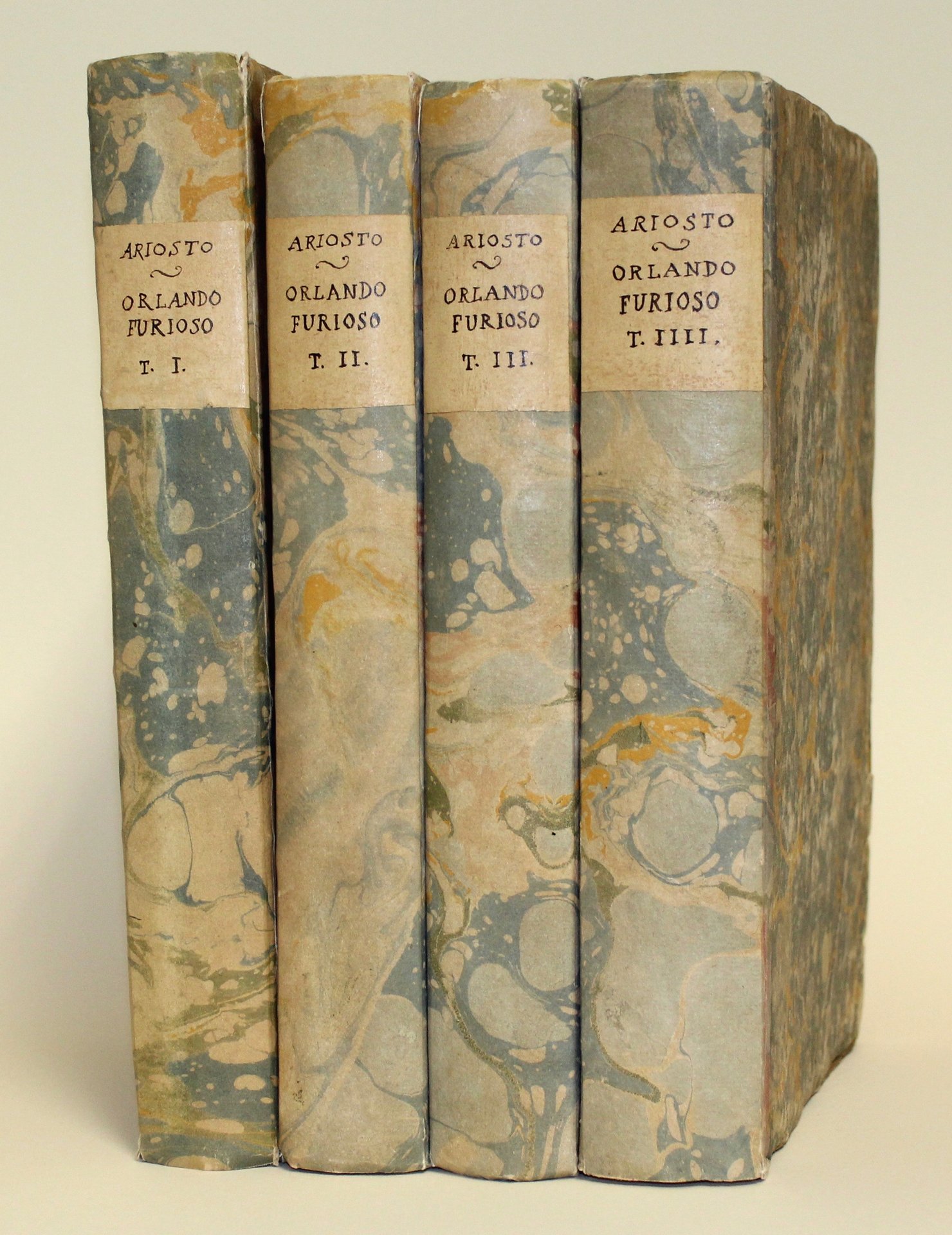 Quattro volumi (mm 310x230); pagg. 24, con occhietto, antiporta, dedicatoria a sua eccellenza il Conte di Bute, ritratto dell'autore entro ovale ed avviso, 5 tavole f.t., pagg. LX seguono circa 1500 pagg. complessive con 51 tavole poste all'inizio di ogni canto disegnate da P.A. Novelli, incise da G. Daniotto, G. Zompini, B. Crivellari, G. Magnini e altri. Raffinati capolettera parlanti, vignette, testatine e cul de lamp, tutto inciso finemente in rame. Il volume quarto, dopo la conclusione del poema, ospita i cosiddetti cinque canti aggiuntivi con stessa impostazione tipografica; in fine le Illustrazioni al Furioso, un ricco apparato di supporto alla comprensione del poema.<BR>Legatura coeva in cartone marmorizzato azzurro/giallo, dorsi originali mancanti sostituiti da dorso moderno in carta marmorizzata simile, titolo manoscritto su tassello cartaceo, ex libris Giorgio Fanan al contropiatto. Celebre edizione del capolavoro ariostesco, che si pone come uno dei capolavori dell'editoria veneziana del '700 per bellezza delle illustrazioni e nitore delle incisioni.<BR>Esemplare fresco con barbe e ampi margini, qualche traccia del tempo ai piatti un poco segnati ad angoli e spigoli. <BR>Morazzoni, p. 57 - Agnelli / Ravegnani, p. 202-203 - Gamba 61 - Graesse, I, 199, "Cette édition enrichie de notes a été faite sur la dernière réimpression de Pitteri (1766) che, come cita il Gamba, tiensi in molta riputazione". <BR>