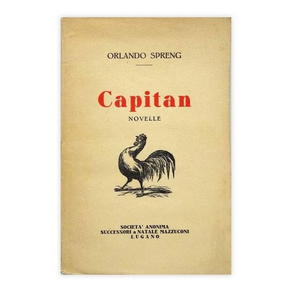 Autore: Orlando Spreng Titolo: Capitan Sottotitolo: Novelle Edizione: Società anonima successori a Natale Mazzucconi - Lugano 1941 Dimensioni: 13,5 x 20,5 cm c.a. Pagine: 76 Copertina: Brossura Condizioni: Ottime come da foto