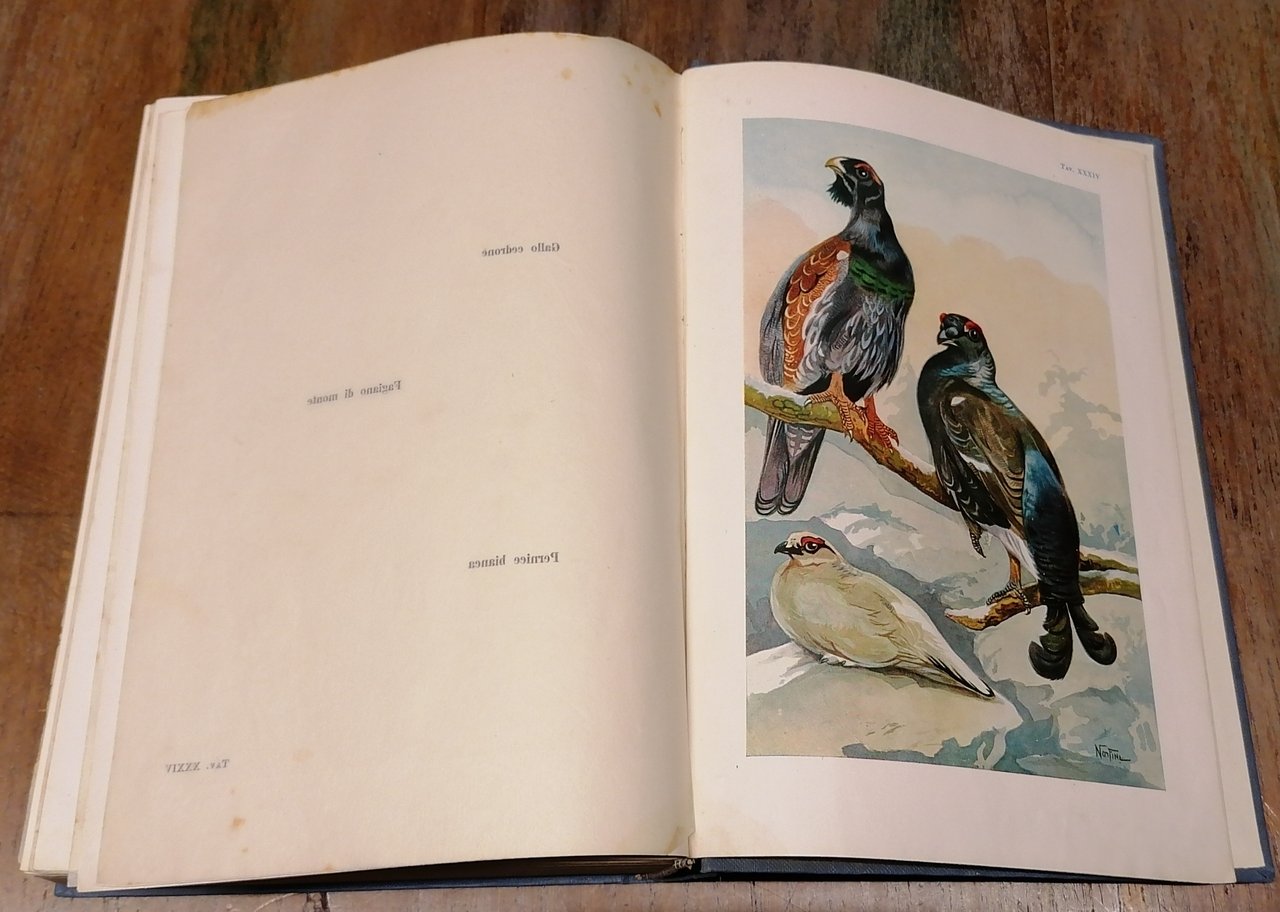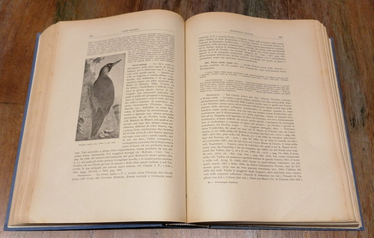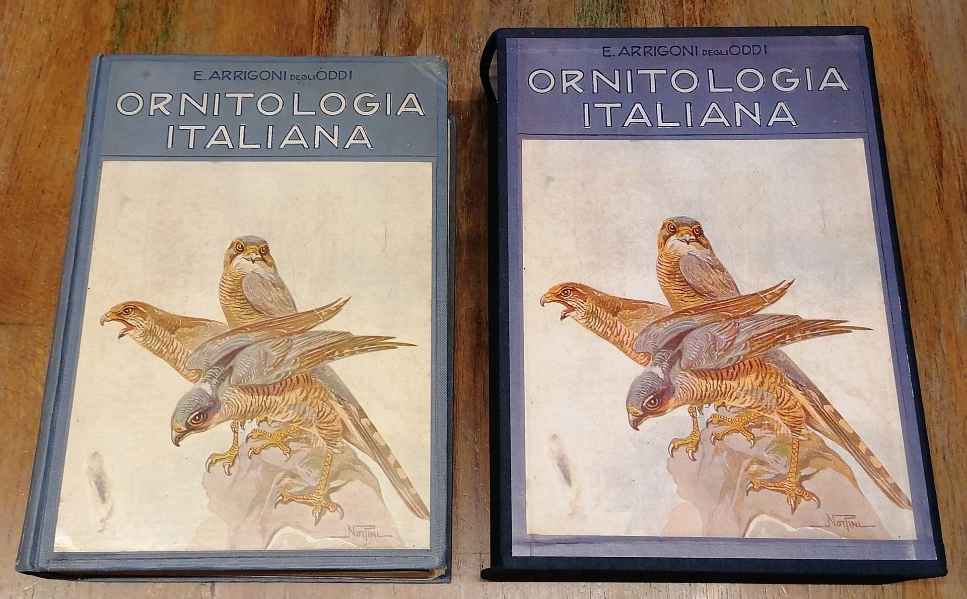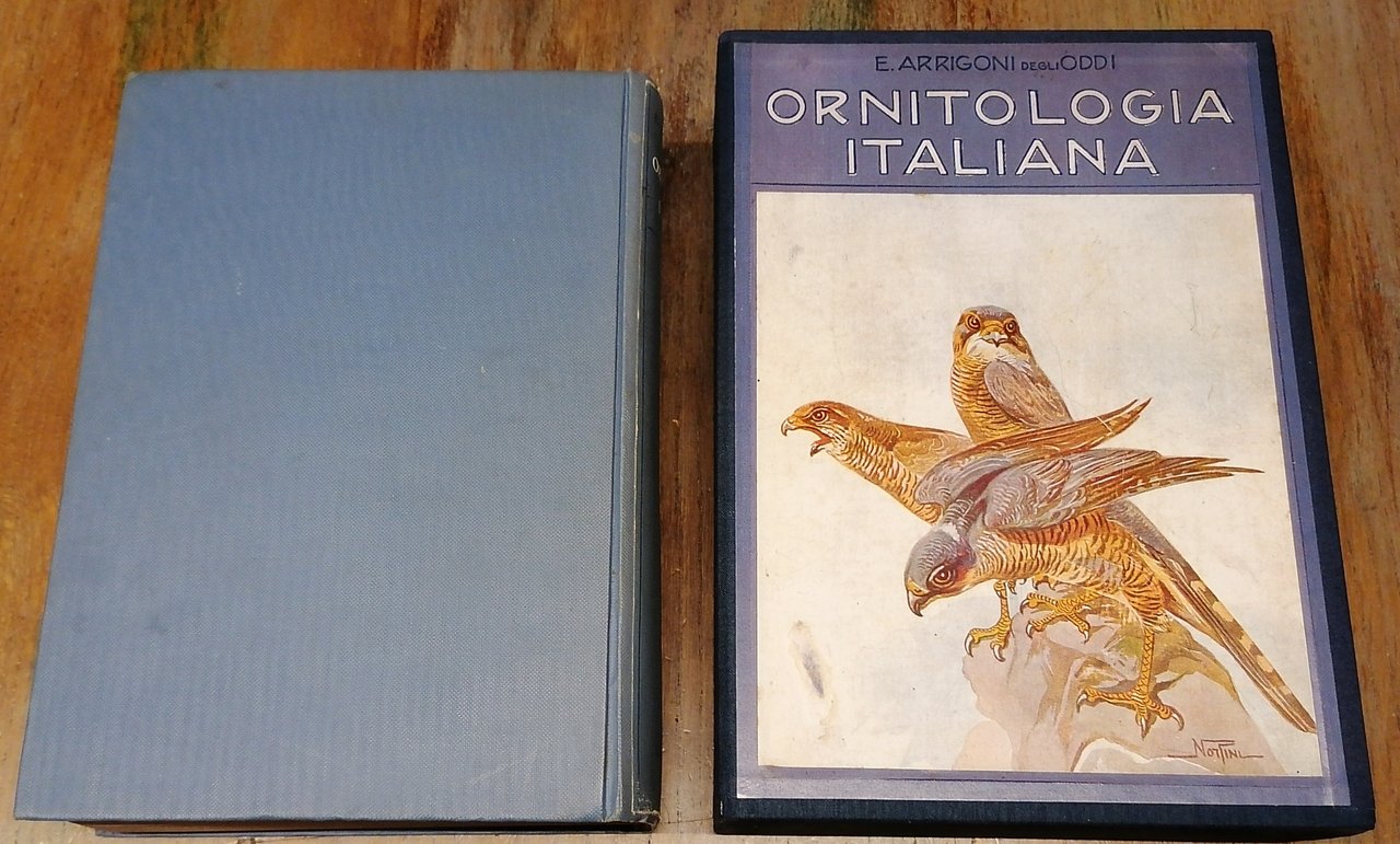In 8° grande, legatura editoriale in piena tela con illustrazione a colori applicata al piatto anteriore, custodia amatoriale in cartone rigido e tela con ai piatti riportata l'identica illustrazione della legatura, pp. CLI,(1),1046,(2), con 586 figure intercalate nel testo e 36 tavole a colori fuori testo del pittore Mario Norfini, protette da veline parlanti. Precede l'opera una bibliografia ornitologica italiana rassegnata al 31 agosto 1928. Edizione originale. Una vecchia firma di proprietà al frontespizio, annotazione a matita di carattere venatorio al margine bianco di pag. 815. Non è presente la velina relativa alla tavola n. 33, qualche rara traccia di ossidazione, peraltro volume solido e in ottimo stato di conservazione.
