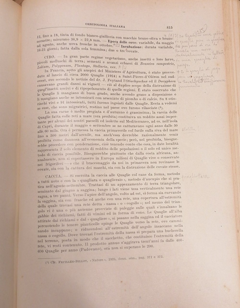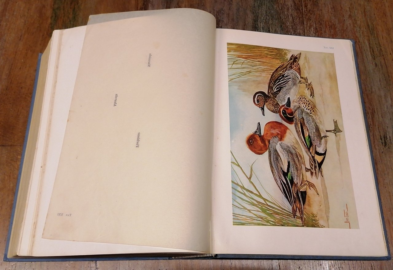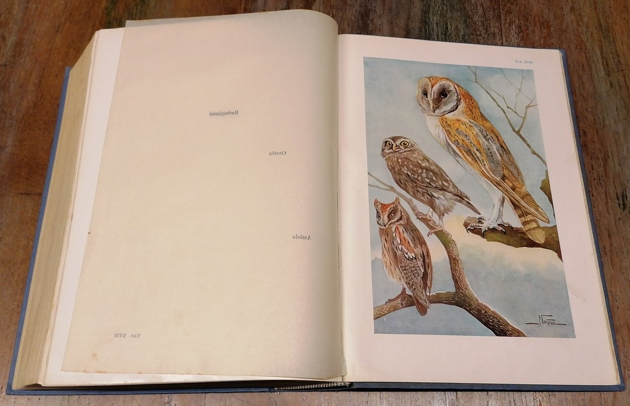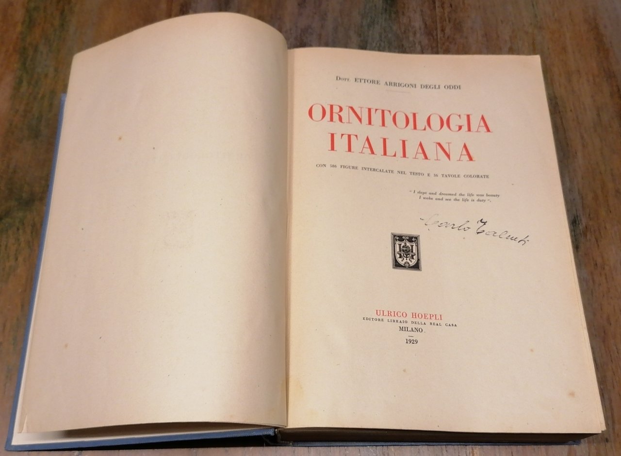 In 8° grande, legatura editoriale in piena tela con illustrazione a colori applicata al piatto anteriore, custodia amatoriale in cartone rigido e tela con ai piatti riportata l'identica illustrazione della legatura, pp. CLI,(1),1046,(2), con 586 figure intercalate nel testo e 36 tavole a colori fuori testo del pittore Mario Norfini, protette da veline parlanti. Precede l'opera una bibliografia ornitologica italiana rassegnata al 31 agosto 1928. Edizione originale. Una vecchia firma di proprietà al frontespizio, annotazione a matita di carattere venatorio al margine bianco di pag. 815. Non è presente la velina relativa alla tavola n. 33, qualche rara traccia di ossidazione, peraltro volume solido e in ottimo stato di conservazione.