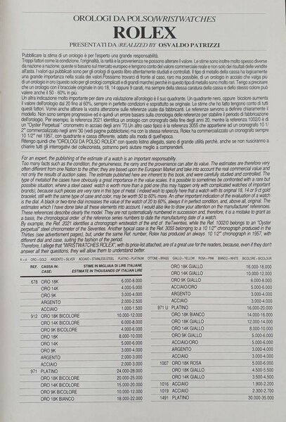 - Prefazione, Gino Paoli - Introduzione - Hans Wilsdorf - Il, bilanciere varabile, la spirale autocompensatrice, la, lubrificazione - Praticità. Affidabilità e Confort - La carica, automatica - Il design - Il cronografo o cronoscopio - Le date, salienti - Immagini pubblicitarie dagli anni trenta agli anni, ottanta - Orologi da polso Rolex selezionati e descritti da, Osvaldo Patrizzi - Indice delle referenze - Allegato Listino