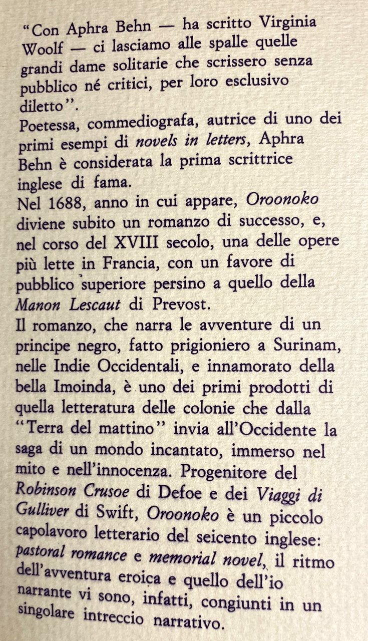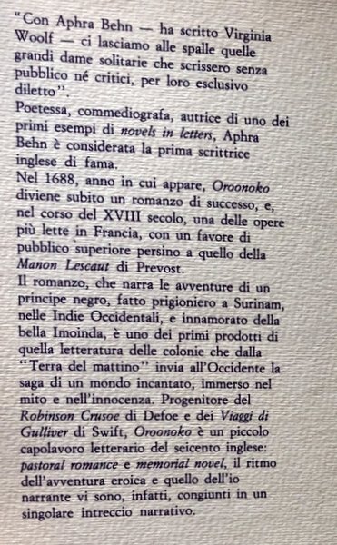 "Con Aphra Behn, ha scritto Virginia Woolf ci lasciamo alle spalle quelle grandi dame solitarie che scrissero senza pubblico né critici, per loro esclusivo diletto". Poetessa, commediografa, autrice di uno dei primi esempi di novels in letters, Aphra Behn è considerata la prima scrittrice inglese di fama. Nel 1688, anno in cui appare, Oroonoko diviene subito un romanzo di successo, e, nel corso del XVIII secolo, una delle opere più lette in Francia, con un favore di pubblico superiore persino a quello della Manon Lescaut di Prevost. Il romanzo, che narra le avventure di un principe negro, fatto prigioniero a Surinam, nelle Indie Occidentali, e innamorato della bella Imoinda, è uno dei primi prodotti di quella letteratura delle colonie che dalla Terra del mattino invia all'Occidente la saga di un mondo incantato, immerso nel mito e nell'innocenza. Progenitore del Robinson Crusoe di Defoe e dei Viaggi di Gulliver di Swift, Oroonoko è un piccolo capolavoro letterario del seicento inglese: pastoral romance e Memorial novel, il ritmo dell'avventura eroica e quello dell'io narrante vi sono, infatti, congiunti in un singolare intreccio narrativo.