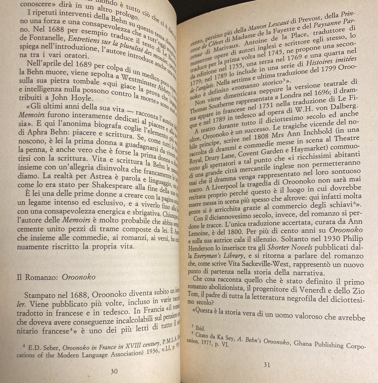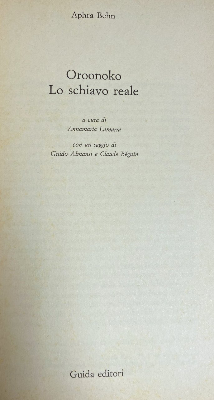 Soggetti: Narrativa inglese, Letteratura anglosassone, Classici, Avventura, Fantastica, Fantasy, Fantascienza, Colonialismo, Imperialismo, Schiavitù, Africa, Impero britannico, Guerrieri, Romanzi storici, Principe negro, Neri, Indie Occidentali, Terra del mattino, Occidente, Oriente, Esplorazioni, Continente Nero, Europei, Tribù, Indigeni, Condottieri, Mito, Selvaggio, Innocenza, Seicento, Schiavismo, Amore, Esotismo, Civiltà, Libri Vintage Fuori catalogo, Scrittrici donne Mutilazione, Bibliografia, Dutch Guinea New World Colonies Nuovo Mondo Scoperte geografiche African warrior Treachery Seventeenth-century novel Love Passion Struggle Human dignity Slaves Margaret Cavendish Maureen Duffy Anne Bradstreet Bodleian Library Montague Summers Otan Parham House Indian John Evelyn Katherine Philips King Royal Slave Negroes Pastoral romance Memorial Novel English Fiction Anglo-Saxon Literature Classics Adventure Fantastic Imperialism Slavery British Empire Warriors Historical Novels Prince Blacks West Indies Morning East Explorations Black Continent Europeans Tribe Indigenous Myth Wild Innocence Seventeenth Exoticism Civilization Books out of print Women writers Mutilation Bibliography Geographical discoveries America Caraibi Collectibles Genere Scrittrici Mothers of Novel Adam Seber Baker Platt