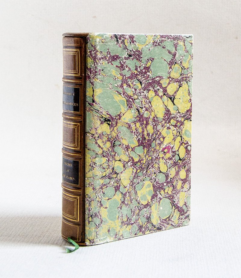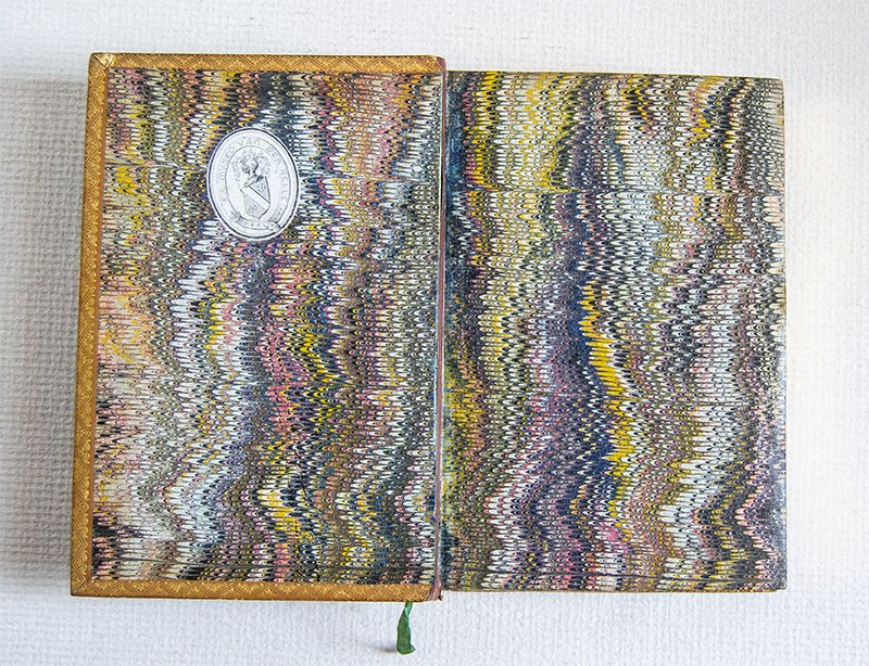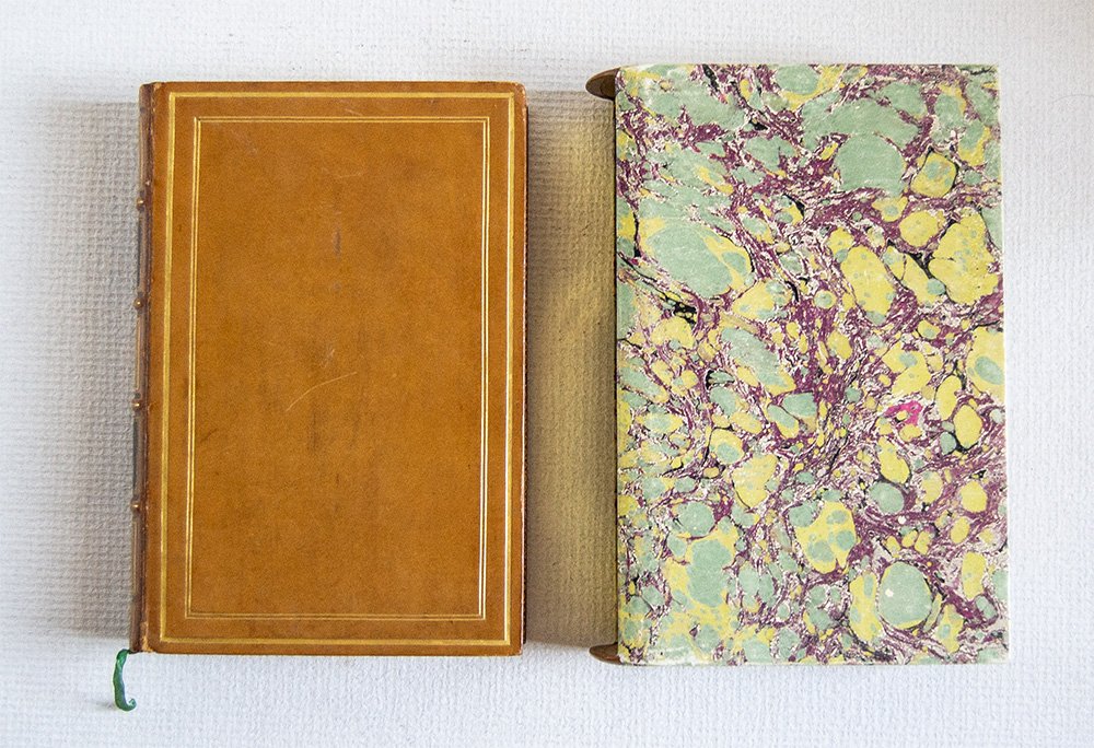 - Piena pelle ottocentesca con custodia rigida in carta marmorizzata. Due tasselli con titoli in oro sul dorso, tagli dorati. Ex-libris Huzard.