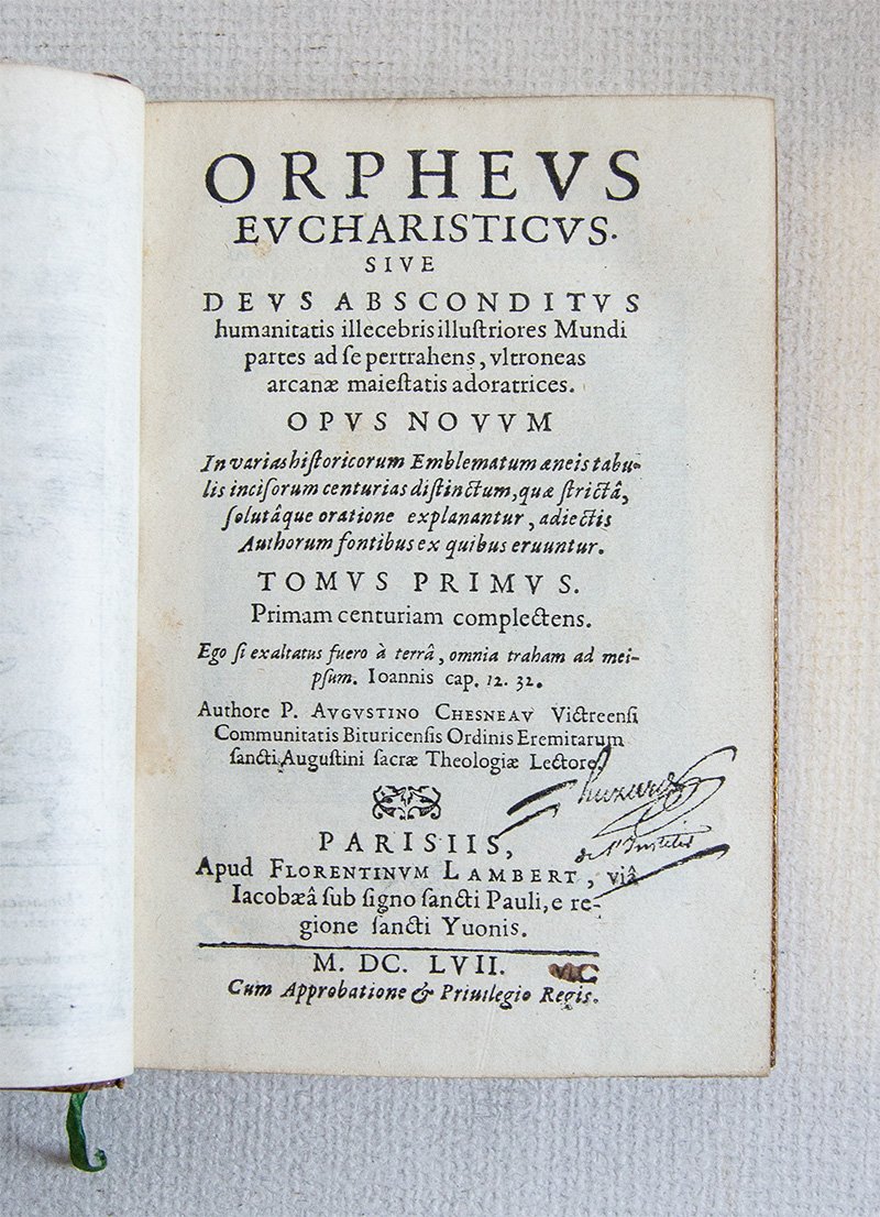 Orpheus Eucharisticus sive Deus absconditus humanitatis illecbris illustriores Mundi partes ad se pertrahens, ultroneas arcanae maiestatis adoratrices. Opus Novum in varias historicorum Emblematum aenis tabulis incisorum centurias dstinctum, quae stricta, solutaque oration explanatur, adiectis Authorum fontibus ex quibus eruntur. Tomus Primus... (Tutto il pubblicato)