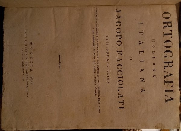 Ortografia moderna italiana.Edizione novissima.Accresciuta di settemila e piu voci che sono del maggior uso nelle lettere, nelle sxcienze e nel commercio, usate dai piu illustri scrittori d'Italia.