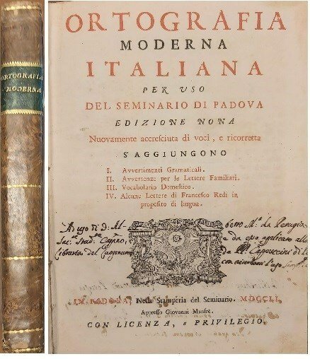 ORTOGRAFIA MODERNA ITALIANA per uso del Seminario di Padova. S'aggiungono I.Avvertimenti gramaticali. II. Avvertenze per le Lettere Familiari. III. Vocabolario Domestico. IV. Alcune Lettere di Francesco Redi in proposito di lingua.