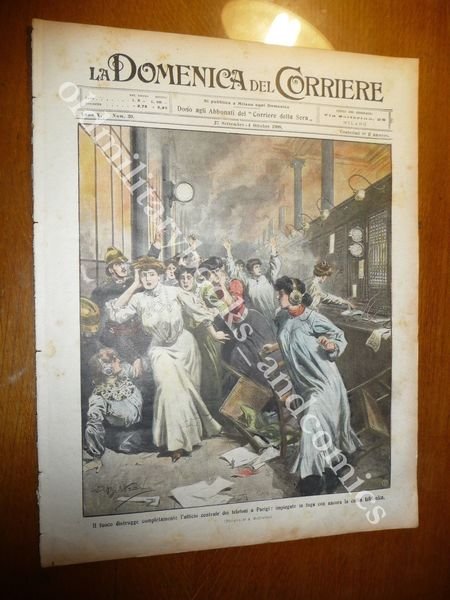 DESCRIZIONE: La Domenica del Corriere del 27 settembre 1908 n. 39 COPERTINA: Il fuoco distrugge completamente l'ufficio centrale dei telefoni a Parigi: impiegate in fuga con ancora la cuffia telefonica. RETRO: I drammi dell'aria: Orville Wright e il tenente americano Selfridge precipitano con l'aereo da trenta metri d'altezza. CONDIZIONI DELL'OGGETTO: Buone/Ottime, rivista senza sovracc. azzurrina, e senza spillette, con strappetti. PESO/WEIGHT: 47 g without package