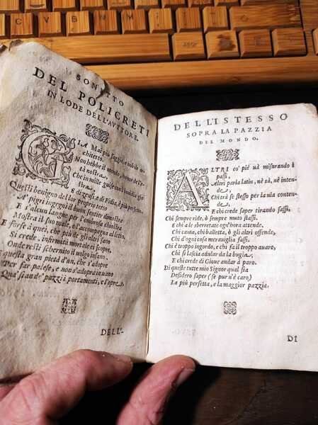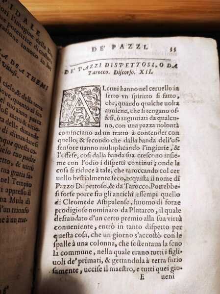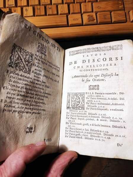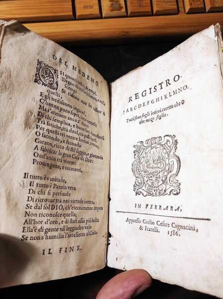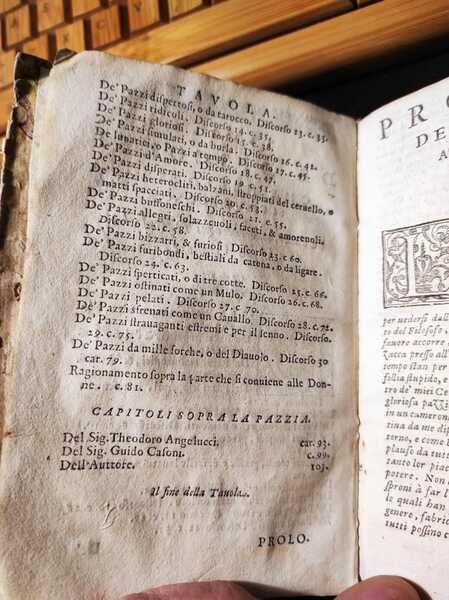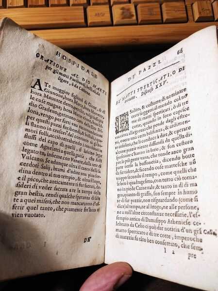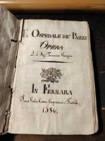 Edizione: Prima edizione . Pagine: 108+XIV . Illustrazioni: Capilettere . Formato: 24° . Rilegatura: Cartonato pergamena con etichetta scritta a mano . Stato: Buono . Caratteristiche: Famoso per "La piazza universale" Tommaso, alla nascita Ottaviano, Garzoni, di Bagnocavallo, monaco della Congregazione Lateranense a Santa Maria in Porto di Ravenna" pubblicò l'"Hospitale" nel 1586. Questa copia è priva del frontespizio stampato, ma scritto in bella grafia, settecentesca "L'ospedale de' pazzi opera del Sig. T