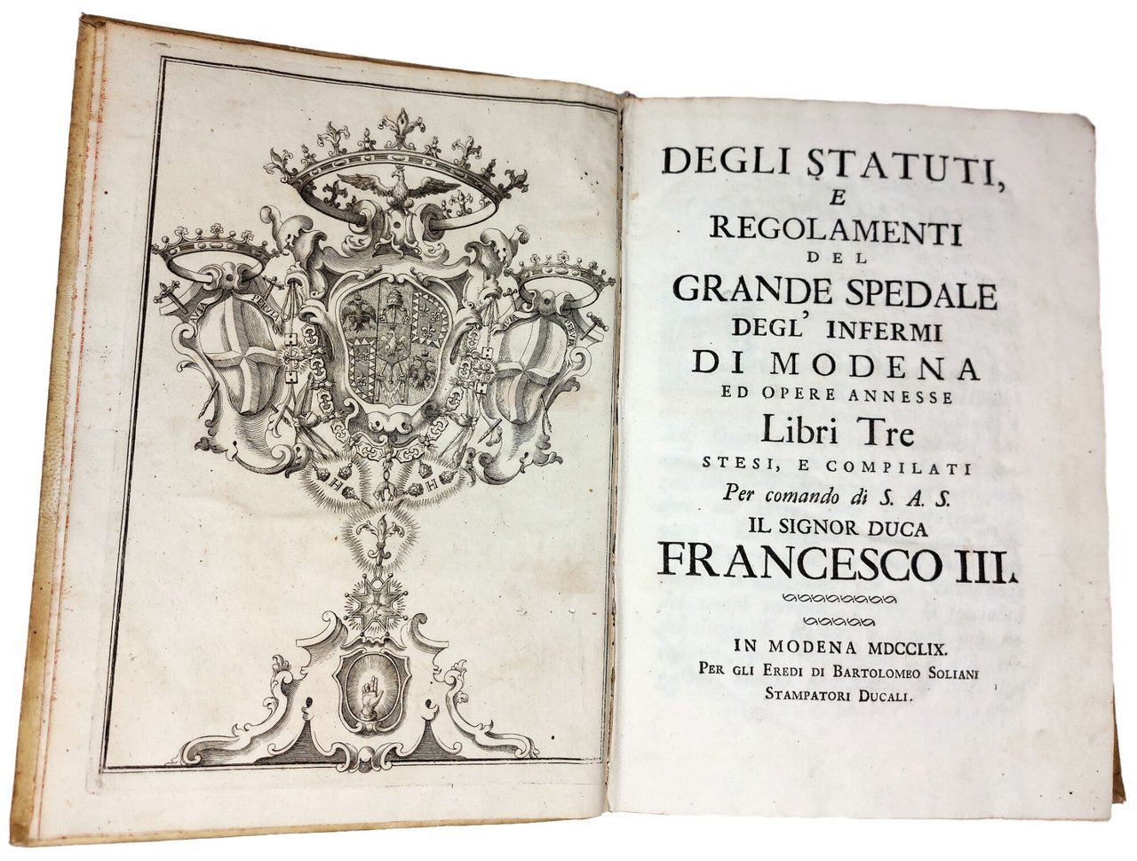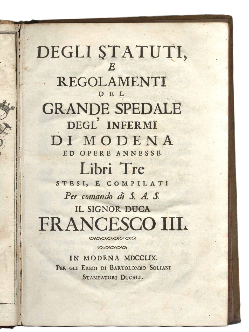 Ospedale degli Infermi. Degli statuti, e regolamenti del grande spedale degl’infermi di Modena ed opere annesse. Libri tre stesi, e compilati per comando di S.A.S. il Signor Duca Francesco III.