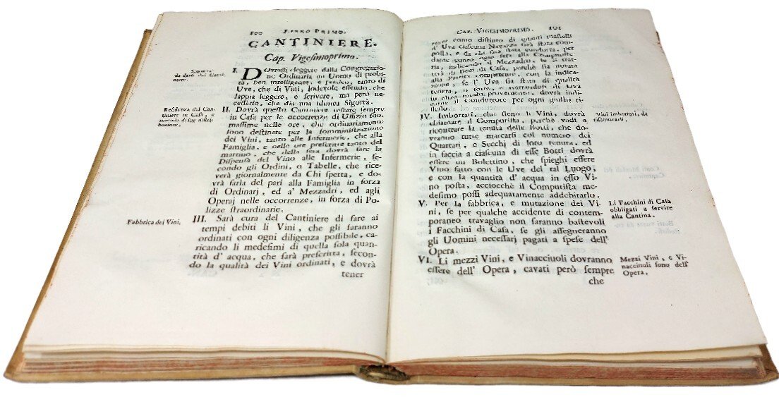 >in-folio (295x205 mm), pp. XV, (1 bianca), 362, (manca l'ultima carta bianca). Antiporta incisa in rame rappresentante lo stemma del ducato di Modena, L'ospedale, progettato da Giuseppe Sozzi, fu completato nel 1758. Legatura piena pergamena rigida coeva, titolo manoscritto al dorso, tagli spruzzati di rosso. Edizione originale del regolamento dell'ospedale e dell'ospizio dei poveri fatti costruire per volontà del duca Francesco III su suggerimento del Muratori. L'opera si divide in tre parti, dedicate rispettivamente agli aspetti direttivi ed amministrativi, all'assistenza sanitaria e, infie, alla Casa di Correzione e all'Ospizio dei Poveri. Ottimo esemplare. Bambi-Conigliello 248; BEGA II, 2-562.