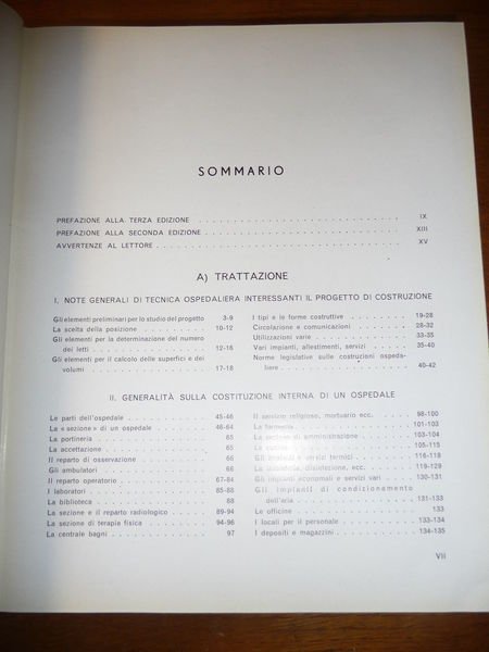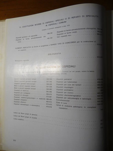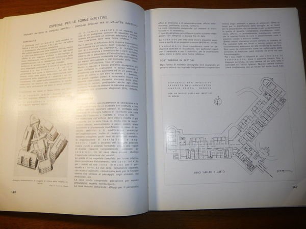 TITOLO: OSPEDALI - OSPEDALI GENERALI E DI SPECIALITÀ - CLINICHE - SERVIZI - TRATTAZIONI DI TECNICA OSPEDALIERA RIGUARDANTI LA COSTRUZIONE E L'ORGANIZZAZIONE - ILLUSTRAZIONE DI 103 OSPEDALI SCELTI FRA I PIÙ MODERNI DI TUTTO IL MONDO DESCRIZIONE: Ulrico Hoepli Milano 1951?, br. ed. pp. XVI+576 in 4° con oltre 1000 illustrazioni (tavole, piante e disegni) in nero. Prefazione alla terza edizione (Milano, 1951) - Prefazione alla seconda edizione (Milano, settembre 1940) - Avvertenze al lettore; B. Franco Moretti (Direttore amministrativo degli Istituti Clinici di Perfezionamento di Milano). Costituzione interna (accettazione, ambulatorio, servizio religioso e mortuario, farmacia, cucina, lavanderia, depositi); Grandi, medi e piccoli ospedali italiani ed europei; Istituti di anatomia, psichiatrici, pediatrici, per tubercolosi, per la cura dei tumori, oftalmici, ortopedici, contagiosi, ginecologici. Tra le centinaia di ospedali: Maggiore di Brescia, di Milano, di Monte Mario in Roma, Villaggio sanatoriale di Sondalo, Psichiatrico di Varese, di Feltre, di Rimini, di San Remo, di Bari, di Belluno, di Biella. Di ogni ospedale sono presenti i progetti e gli architetti. Indice completo in foto. CONDIZIONI: Ottime, vol. leggermente allentato, ma poco. PESO / WEIGHT: 1999 gr. without package