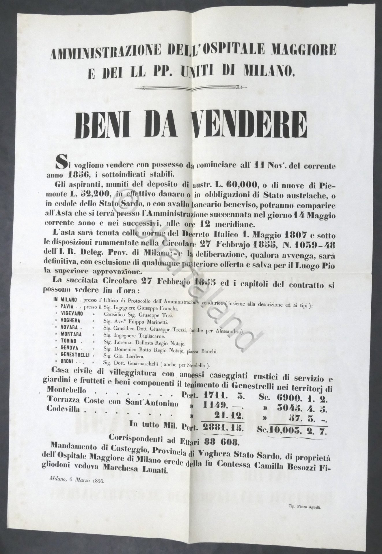 Ospitale Maggiore di Milano - Manifesto: Beni da vendere - 1856