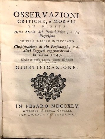 Osservazioni critiche, e morali in difesa della storia del Probabilismo, e del Rigorismo contra il libro intitolato Giustificazione di più personaggi, e di altri soggetti ragguardevoli. In Lucca 1743. Esposte in questa Lettera, diretta all’Autore della medesima giustificazione