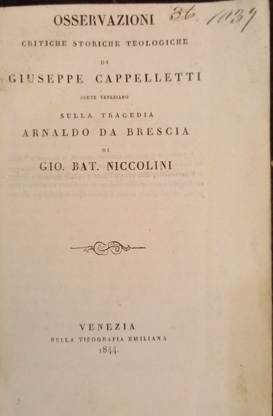 Osservazioni critiche, storiche e teologiche sulla tragedia Arnaldo da Brescia di Gio. Bat. Niccolini. Venezia, Tip. Emiliana, 1844.