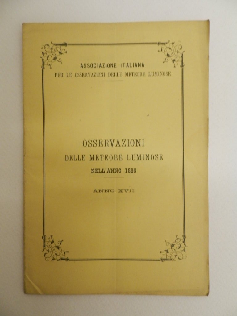 16^, pp. 9, brossura editoriale con titolo inconiciato al piatto, allegata una tabella di 4 pagine dal titolo: Notti prescritte per le osservazioni simultanee delle stelle cadenti, elenco delle stazioni e degli osservatori d'Italia. Lieve piegatura di spedizione, ottimo stato di conservazione.. *** TUTTI I NOSTRI LIBRI SONO VISIBILI PREVIO CONTATTO MAIL O TELEFONO NELLA NUOVA SEDE DI MILANO: LIBRERIA COSMOPOLIS, VIA JOMMELLI, 22. ***