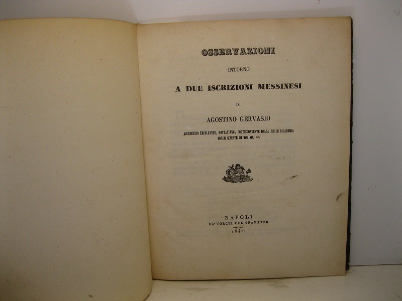 In 8, pp. 40 + (2). Cart. coeva con d. in tela. Saggio relativo a due iscrizioni, una greca e l'altra latina, venute alla luce durante gli scavi archeologici in largo S. Giovanni Gerosolimitano a Messina. Mira, I, p. 418. Narbone, p. 36.