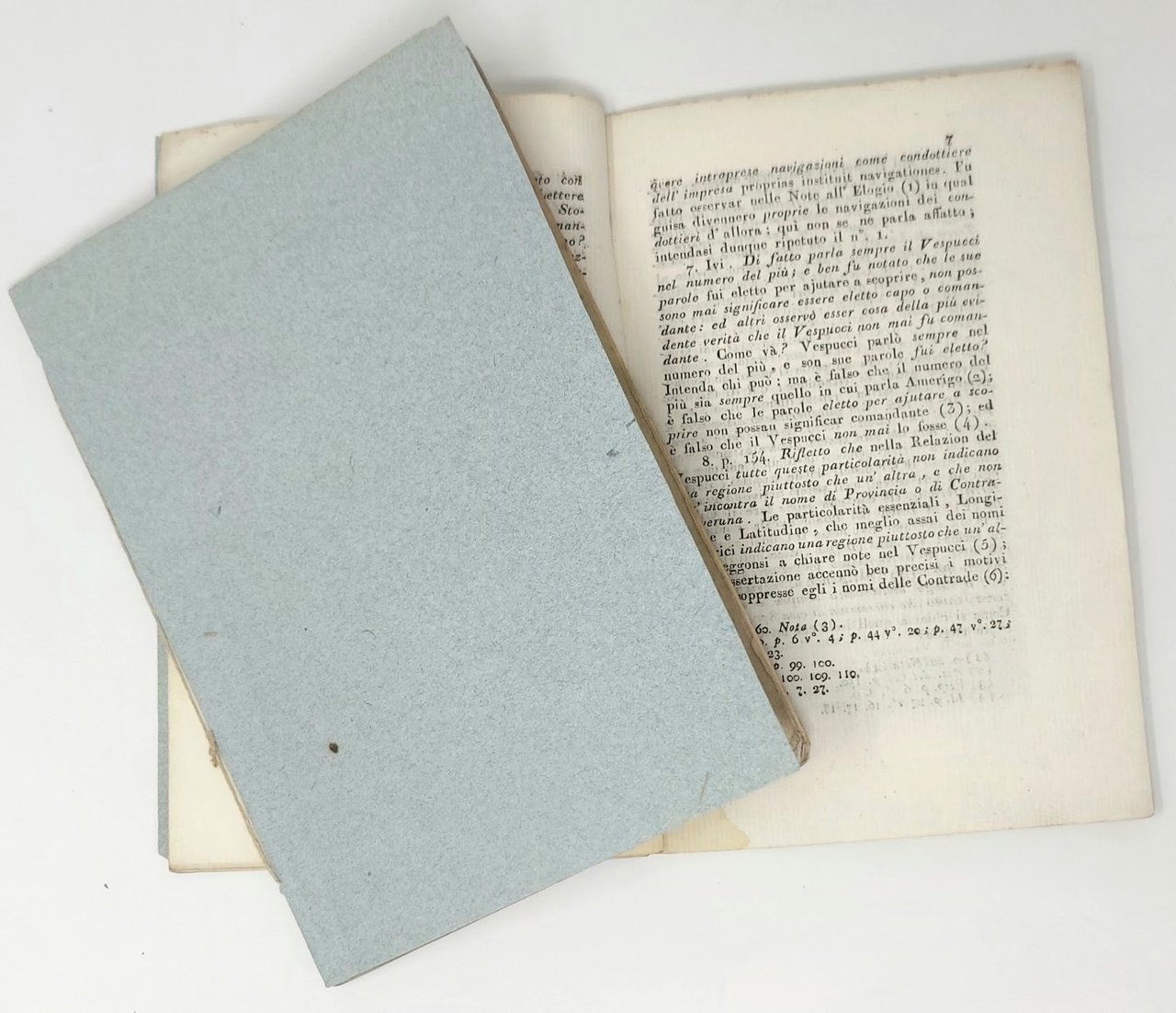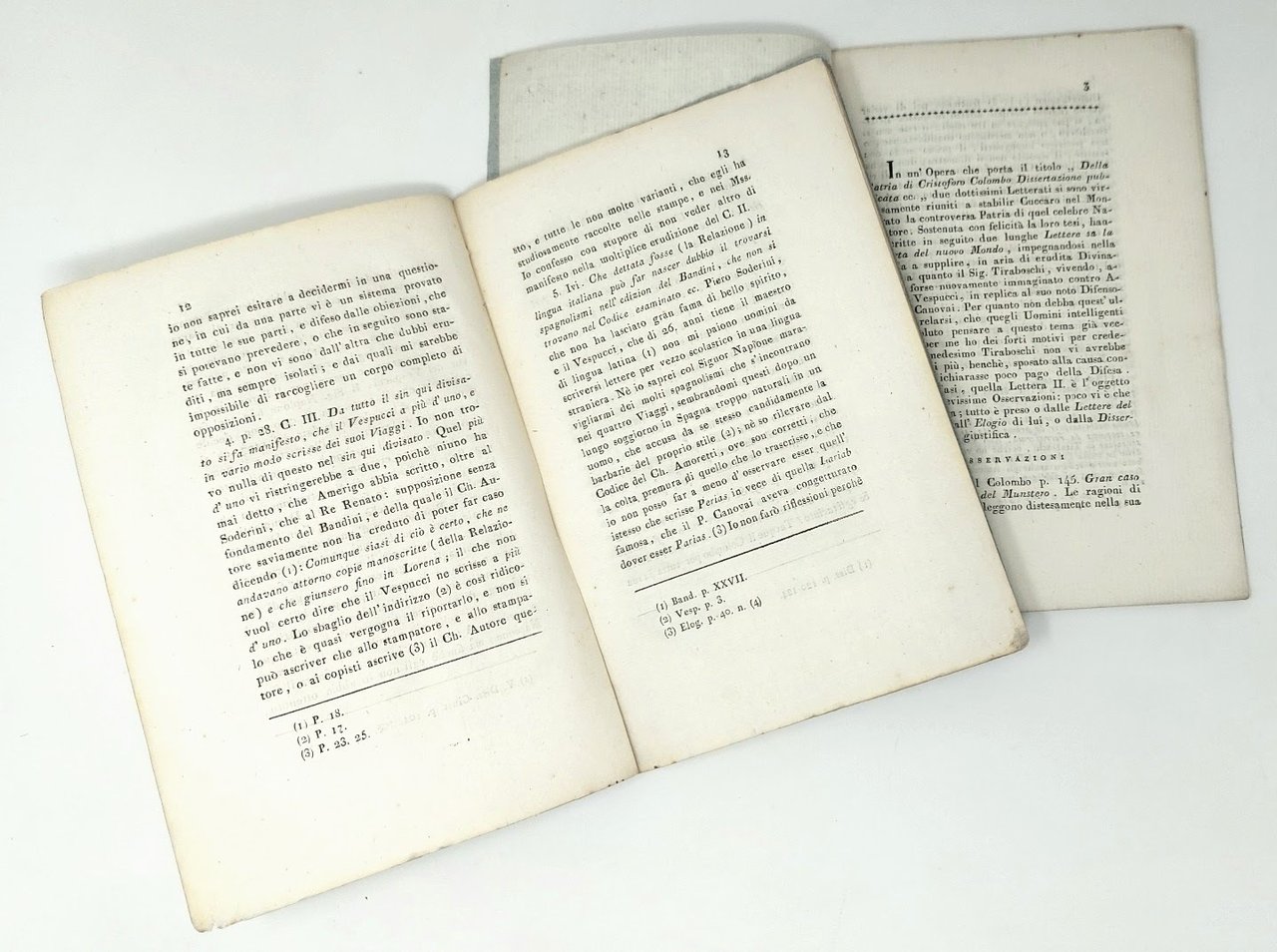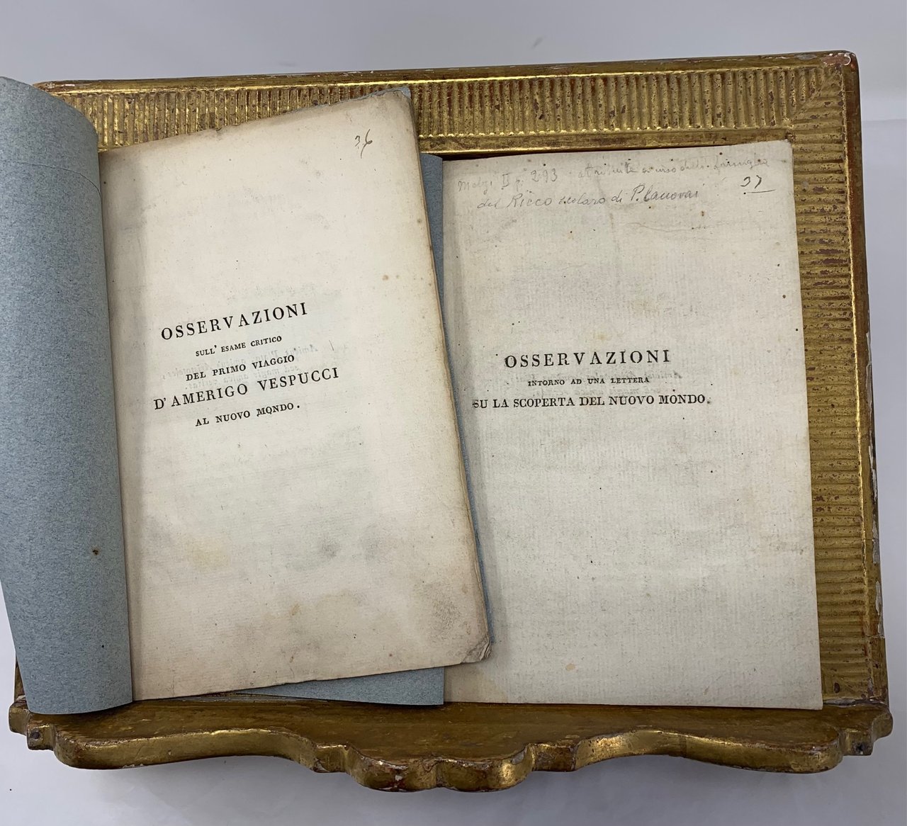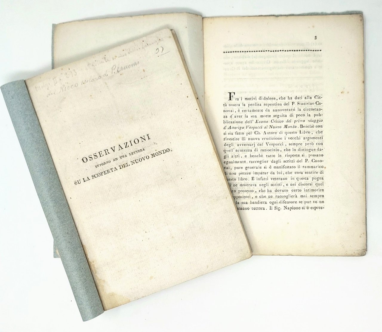 >2 volumi in-16, pp. 16; 33, entrambe in cartoncini azzurri coevi. Rari libelli, censiti in pochissime biblioteche italiane. Il primo testo era stato letto dal Canovai (1740-1788) all'Accademia Etrusca di Cortona il 15 ottobre 1788, suscitando un vivace dibattito, attribuendo a Vespucci il merito di scoperte ascritte invece a Colombo, nonché di esser giunto nelle Americhe un anno prima di questi. I due si conobbero comunque a Siviglia nel 1489. La seconda operetta fu pubblicata dal Capponi (1792-1876) , non senza spiccate rivendicazioni campanilistiche, durante il soggiorno fiorentino. In entrambe intervenì il Galleani Napione, storico in genere attendibile, ma che qui “con troppa frequenza per focoso amor patrio” sosteneva che Colombo fosse nativo di Cuccaro in Monferrato, oltre al suo primato nei confronti di Vespucci. (Lievi aloni).