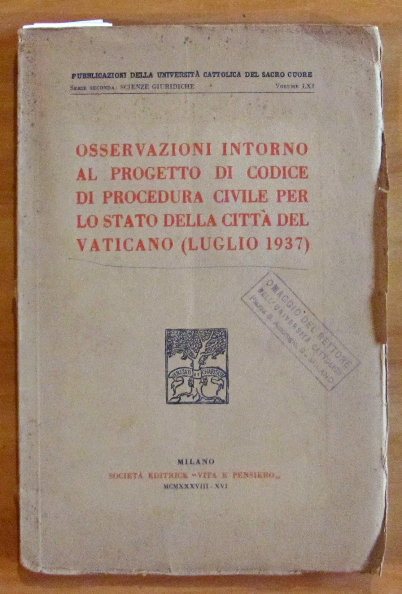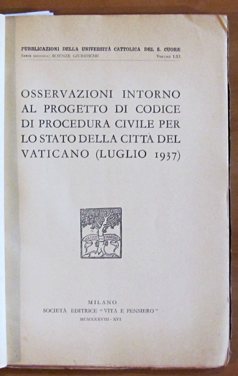Pubblicazioni della Università Cattolica del Sacro Cuore. Serie Seconda: Scienze Giuridiche. Osservazioni intorno al progetto di Codice di procedura civile per lo Stato della Città del Vaticano (Luglio 1937). Società Editrice Vita e Pensiero - Milano, 1938. Brossura editoriale con piccole barbe ai margini esterni delle sole copertine. Timbro "Omaggio del Rettore dell'Università Cattolica Piazza S. Ambrogio Milano". Interno intonso. 17x25. Raro e in Buonissimo stato. , Molto buono (Very Good)