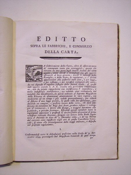 Cm. 25,5 x 19,5; cc. 7 n.n., pp. 62; cartonato marmorizzato coevo con titolo manoscritto su etichetta al dorso.<BR>Ottime condizioni di conservazione: solo lievi abrasioni al dorso e ammaccature agli angoli dei piatti; per il resto carta forte e bianca, ampi margini, legatura solida.<BR>Purtroppo, come spesso accade con questo volume, mancano le due tavole illustranti la macchina del mulino a cilindro.