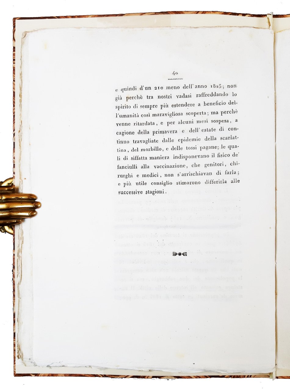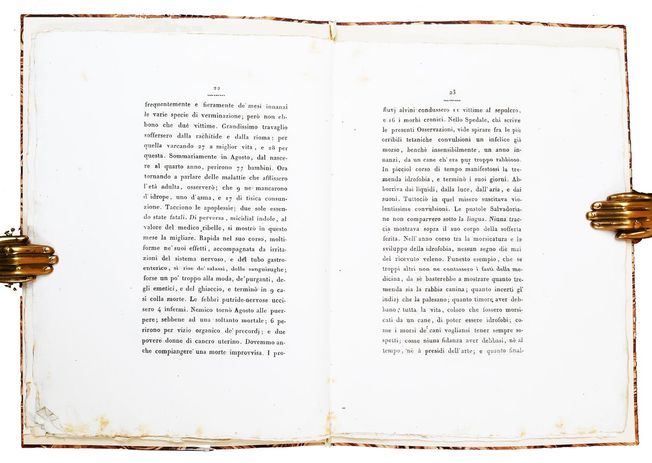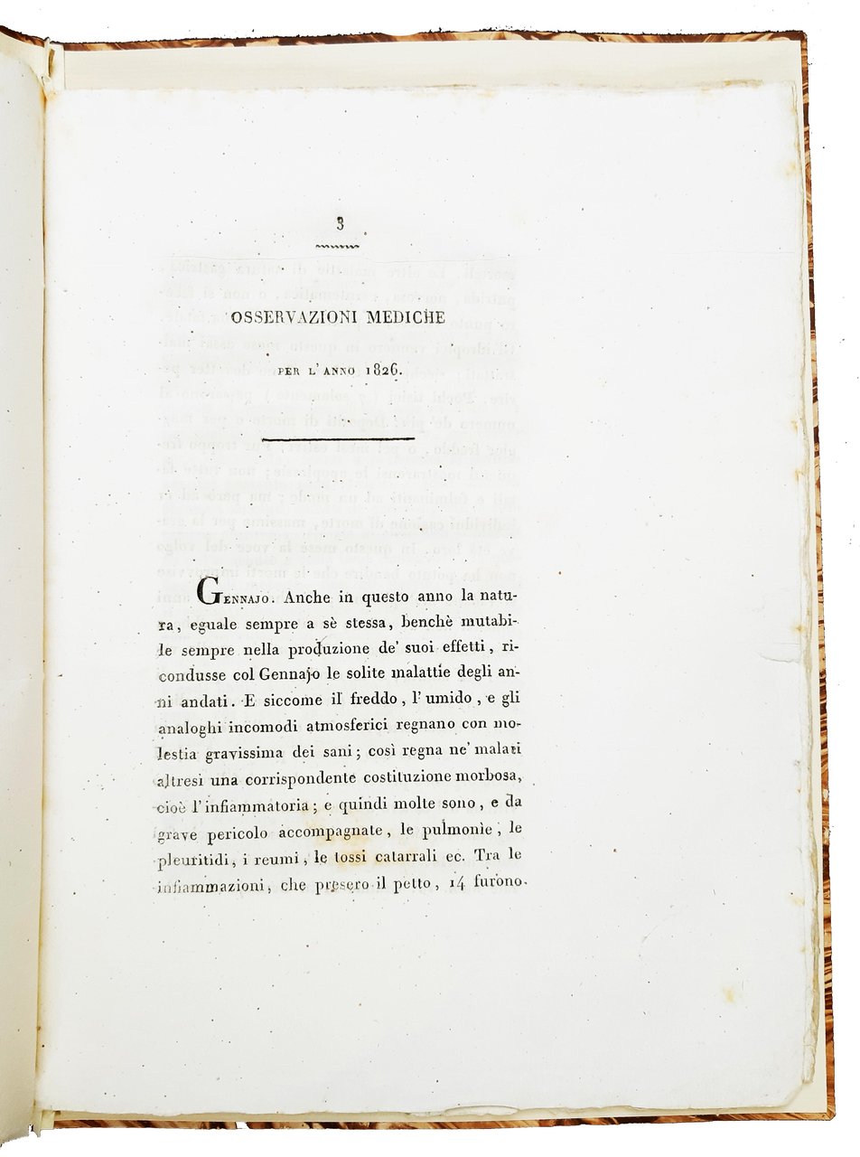 in-4°, 258x196 mm, fascicoli legati all'interno di una cartella rigida rivestita di carta marmorizzata; pp. 40. Stemma dell'Accademia di agricoltura di Verona sul frontespizio. Interessante rapporto medico annuale sul territorio veronese, fatto dal D. Alberto Brunelli per conto dell'Accademia d'Agricoltura Commercio ed Arti. Rif.: IT\ICCU\VIAE\039869. OCLC, 558505901 (1 copia presso la British Library, UK, della raccolta completa dei testi pubblicati dal 1820 al 1841). Cond.: Carte in barbe, pulite e croccanti. Esemplare quasi ottimo.