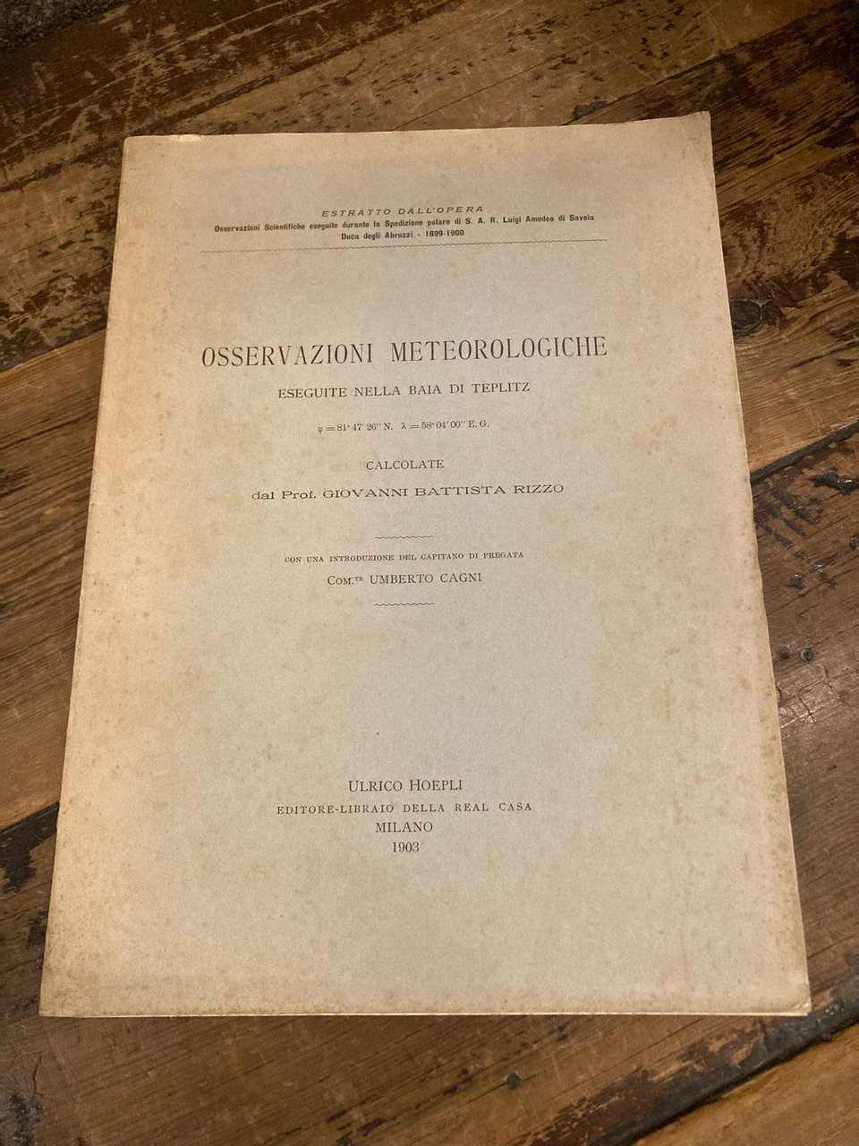 Osservazioni meteorologiche eseguite nella Baia di Teplitz calcolate. Con una introduzione del Capitano di Fregata Com.te Umberto Cagni. Estratto dall'opera Osservazioni Scientifiche eseguite durante la Spedizione polare di S. A. R. Luigi Amedeo di Savoia Duca degli Abruzzi. 1899 - 1900