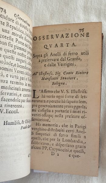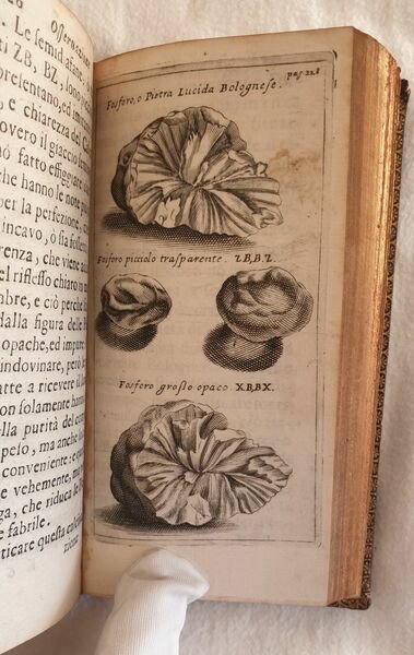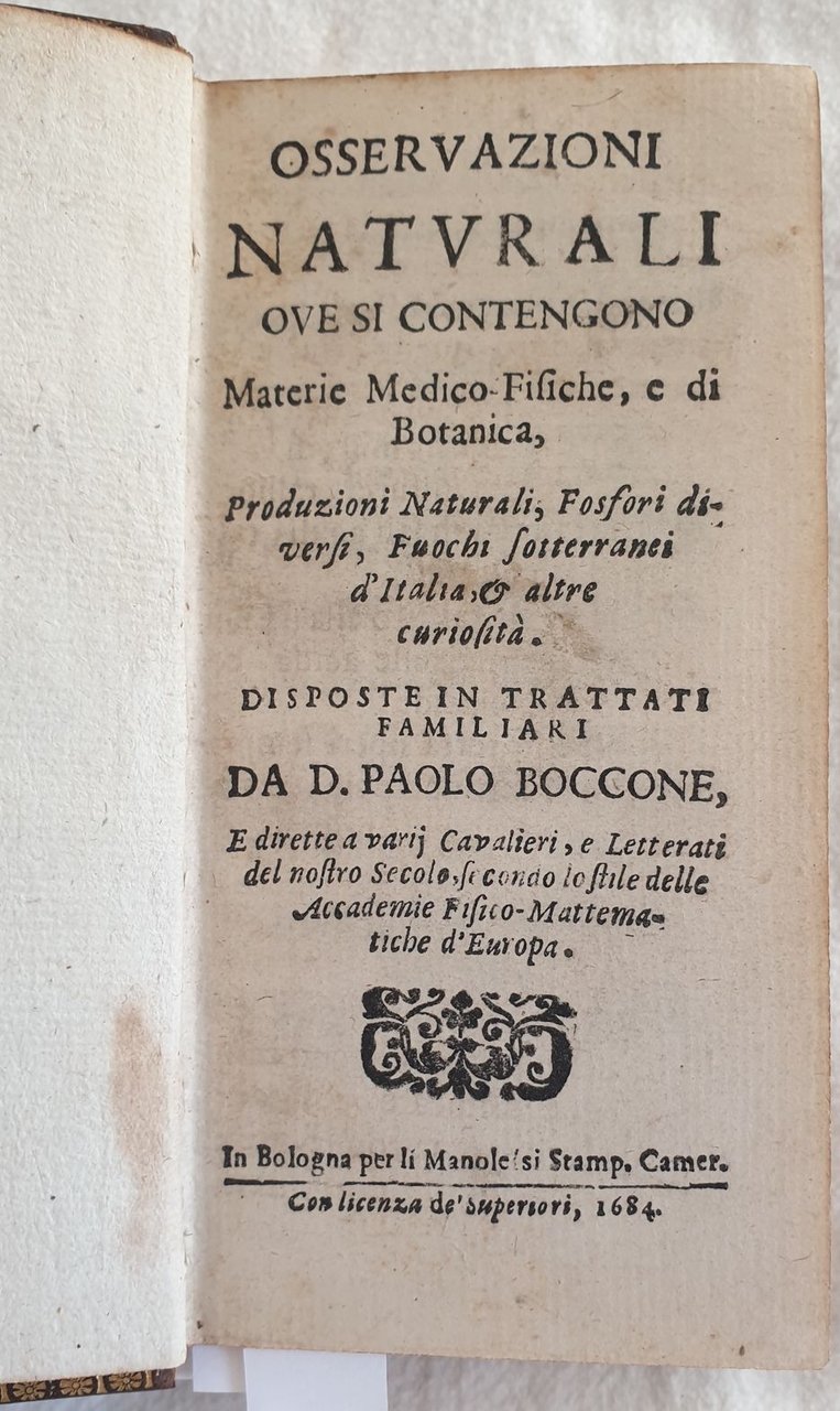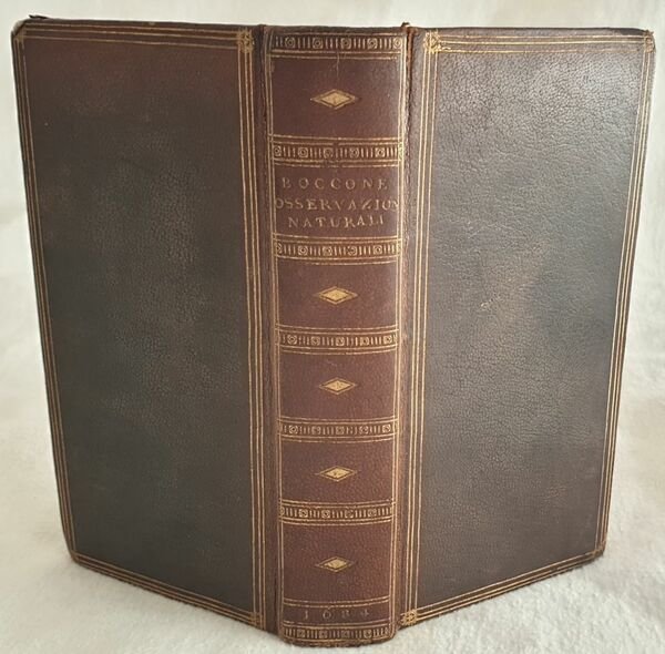 Rara edizione originale del 1684, variante A, di questa interessante opera di storia naturale del botanico originario di Palermo Paolo Silvio Boccone (1663-1704). Boccone compì i suoi studi a Padova, Perugia e Pisa. Viaggiò moltissimo per poi stabilirsi a Padova dove divenne professore di botanica. Fu botanico di corte del Granduca di Toscana Ferdinando II contribuendo allo sviluppo del Giardino dei Semplici di Firenze. Coniò diverse specie ed ebbe grandi meriti nella diffusione della patata come pianta alimentare. Questa sua celebre opera raccoglie i risultati di numerose indagini e ricerche sui più variegati fenomeni naturali, geologici, medici e terapeutici. All'interno sono presenti due tavole fuori testo. Alcune delle osservazioni contenute nell'opera: Sopra il fosforo aereo, Intorno ai fuochi sottterranei osservati nel Modenese, Intorno alcuni preservativi e curativi medicamente in tempo di peste, Sopra gli anelli di ferri utili a preservare dal granso e dalle vertigini, Intorno alcune pietre medicamento per gli occhi di granchio, Intorno alcuni medicamenti empirici e produzioni naturali della Pieve di Quero nello stato della Repubblica veneta, Acqua fumante e sue curiosità, Carabe bianco e ambra nera trovata in Italia, nido di alcuni insetti nell'ostrica petrificata, alcune piantre come medicamento, Sopra le mammelle lattifere di un uomo, Del fosforo o pietra lucida di Bologna, Uso dell'antimonio, In ordine al Fonte Pliniano e Fiume Torbidone, Delle mosche e formiche pisane odorose, Coralli e piante maritime, Sopra alcune esalazione della terra sulfuree, Sale ammoniaco e pietre gipsee del bolognese ecc. Manca l'errata finale peraltro mancante in tutti gli esemplari apparsi in commercio presenti nei registri che abbiamo avuto modo di consultare. In ottime condizioni. Copertina in piena pelle ottocentesca con titolo e decorazio i in oro in ottime condizioni con lievi usure. Legatura in ottime condizioni. Pagine in ottime condizioni con rare fioriture. Manca l'errata finale peraltro mancante in tutti gli esemplari apparsi in commercio presenti nei registri che abbiamo avuto modo di consultare. In 16. Dim. 15x8 cm. Pp. (14)+400. Scarce original edition of 1684 of this interesting work of natural history by the botanist from Palermo Paolo Silvio Boccone (1663-1704). Boccone studied in Padova, Perugia and Pisa. He travelled a lot and then established in Padova where he became teacher of botany. He was botanist in the Court of Granduca di Toscana Ferdinando II contributing to the development of Giardino dei Semplici in Florence. He gave the name to different speciees and had the merit to spread the usage of potato as a food plant. This famous work collects the results of different studies and researches about different natural phenomena, geology, medical and therapeuticals . In very good conditions. Half leather cover of 19th century with gilted title and decorations in the spine in very good general conditions lightly worn in the extremities. Binding in very good conditions. Inside pages are in very good conditions with occasional foxing. Final errata lacks as appears in almost all copies sold verified. In 16. Dim. 15x8 cm. Pp. (14)+400. <BR><BR>
