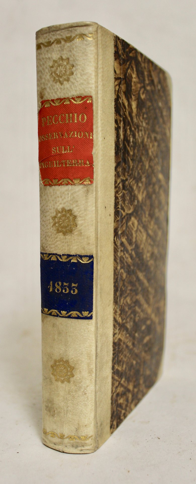 In 16° (mm 180x110) rilegato in mezza pergamena con fregi oro, doppio tassello blu e arancio, titoli dorati al dorso, pp. VIII-363, (1). Bellissima copia. Osservazioni sulla società inglese, costumi, politica, architettura, sull'Inghilterra come rifugio di oppressi e perseguitati. In 16° (mm 180x110) rilegato in mezza pergamena con fregi oro, doppio tassello blu e arancio, titoli dorati al dorso, pp. VIII-363, (1). Bellissima copia. Osservazioni sulla società inglese, costumi, politica, architettura, sull'Inghilterra come rifugio di oppressi e perseguitati. <BR><BR><BR>
