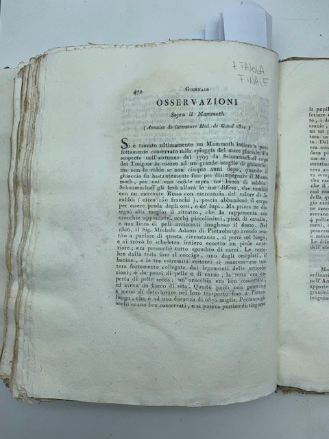 In 8 (cm 22 x 28,5), pagine numerate da 472 a 476 con 1 tavola incisa all'acquaforte raffigurante lo scheletro della testa del mammouth e dell'elefante. Ampia gora sul foglio con la tavola. Brossura rifatta con carta d'epoca. Stralcio dal "Giornale di Fisica, chimica e storia naturale." di L. V. Brugnatelli, tomo III, 1810.