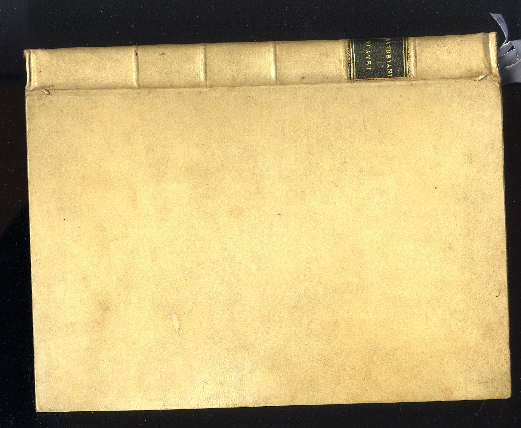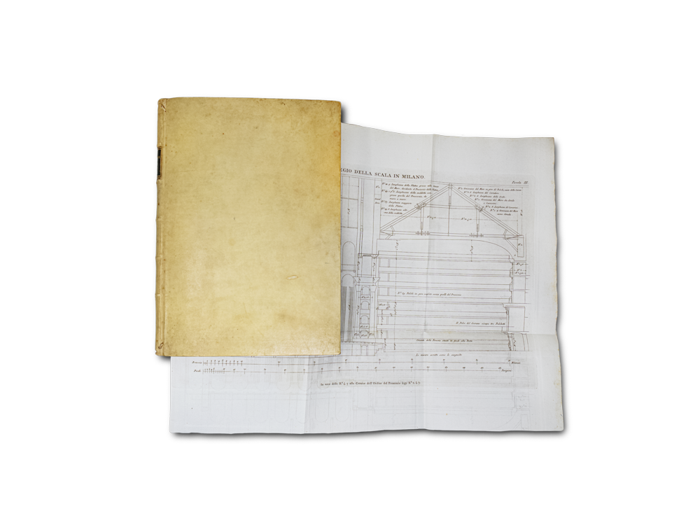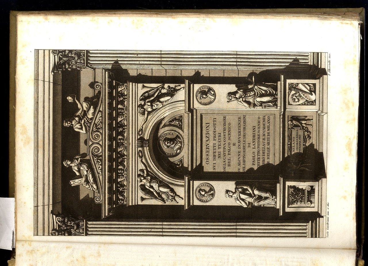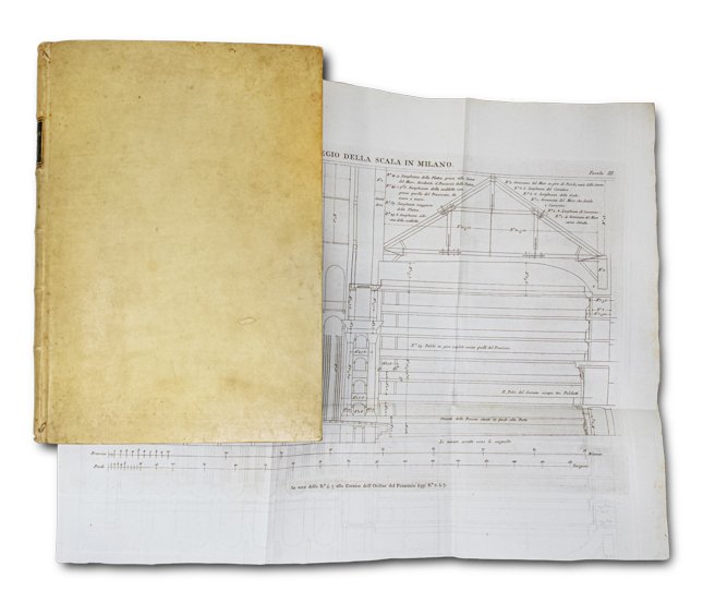 >4 parti in un vol. in-4 (mm 268 x 195). I:) pp.(4), 53, con fuori testo 1 frontispizio fig. inciso all'acquaforte e 7 tavole inc. ripiegate. II:) pp.43, front. fig. inc. e 3 tavole ripeg. f.t. III:) Appendice alle Osservazioni, pp.60, frontisp. fig. inc. e 5 tavole ripieg. IV:) Appendice seconda... pp.40, front. inc. e 2 tavole ripieg. f.t. I 4 titoli figurati assai belli, sono inc. all'acquatinta da Albertolli. Ottima legatura coeva in piena pergamena rigida, dorso a nervi con tassello per titolo oro. Complessivam. illustrato da 17 grandi tavole di piante e spaccati di teatro. Prima edizione di rara opera che analizza con dettaglio il palco, il proscenio, le scene, le quinte, le prospettive, i chiaroscuri, etc. Completa delle quattro parti, raramente tutte presenti. Landriani fu architetto e scenografo al teatro alla Scala dal 1792 fino alla morte. Innovativa fu la sua critica alla scenografia barocca, auspicando un sistema di regole neoclassiche per la decorazione scenografica. Ex libris al contropiatto superiore, eseguito negli anni venti dal pittore Oscar Ghiglia per lo scrittore, giornalista e critico d'arte Ugo Ojetti (1871-1946). L'immagine rappresenta un Pierrot che cerca di raggiungere la Luna per mezzo di una scala. Esemplare ben conservato, raro. Berlin Katalog n.2801. Cicognara 760.