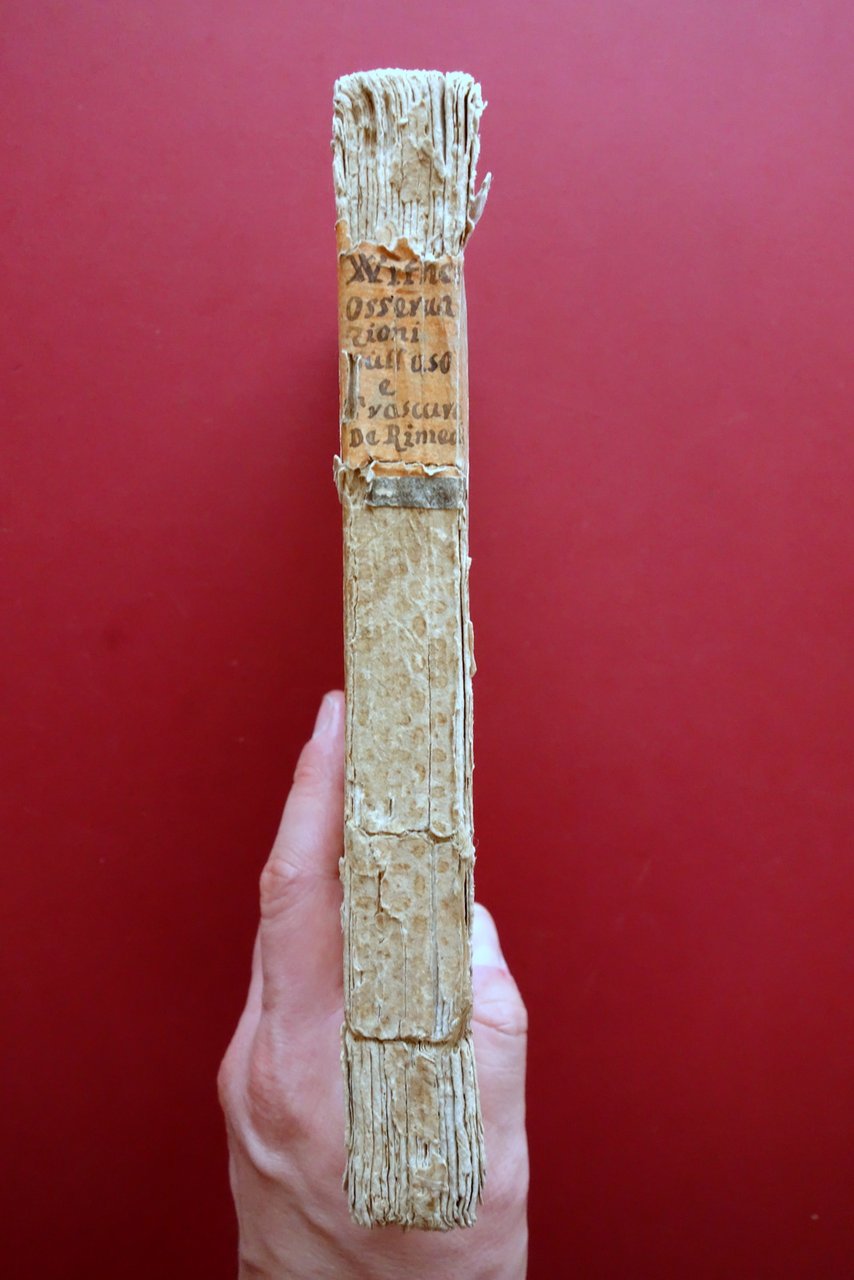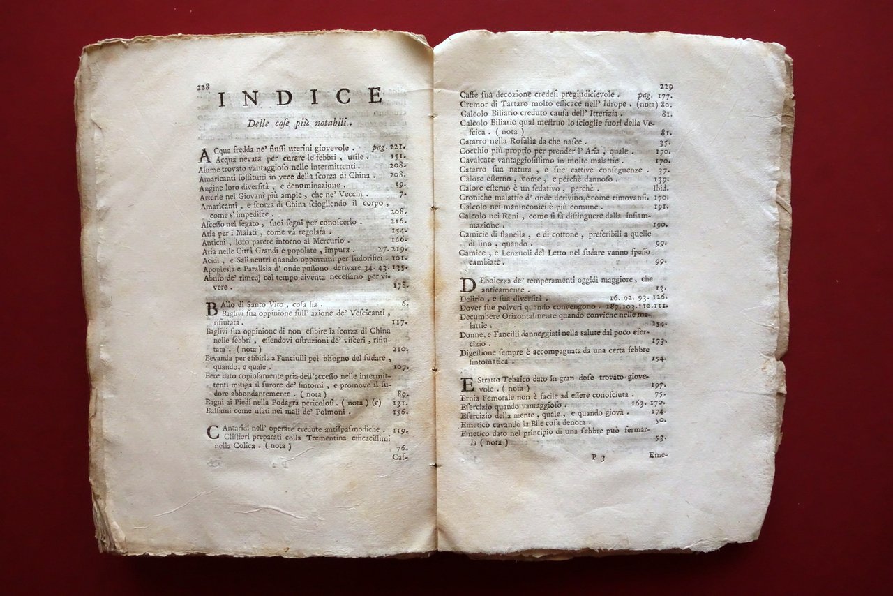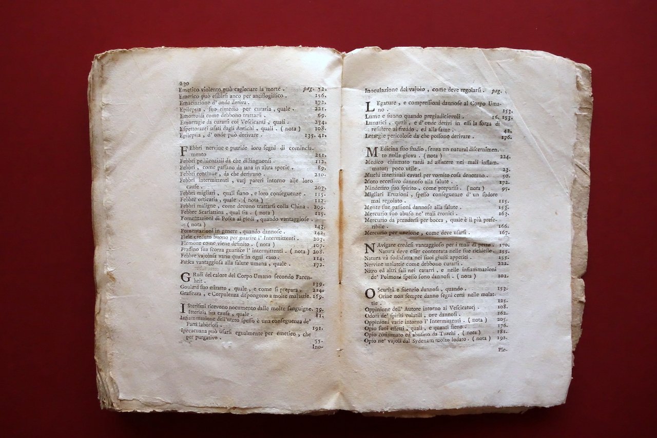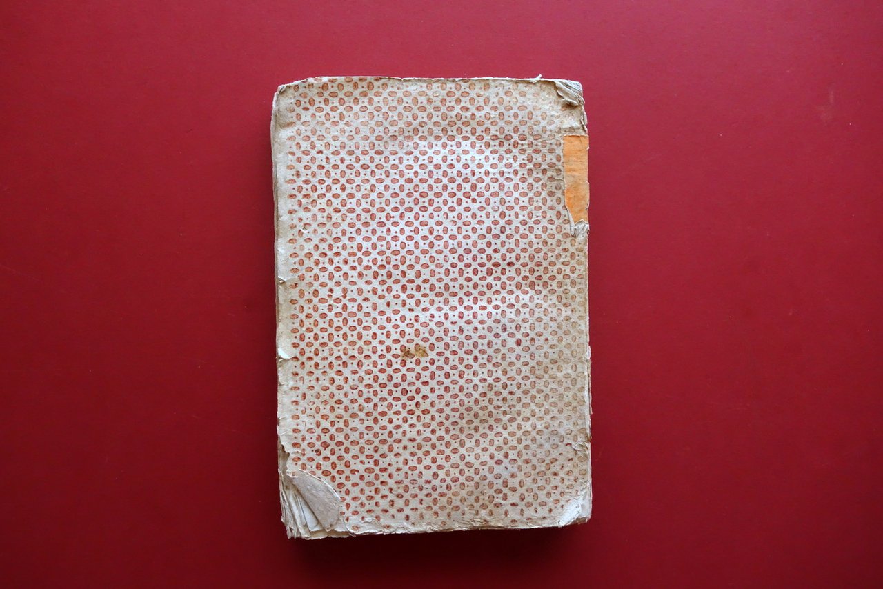 Thomas Withers, † Osservazioni sull'uso, abuso, e trascuraggine de'rimedi del signor Tommaso Withers dottore di medicina opera istruttiva non solo per i studenti di medicina, chirurgia, e farmacia, ma anco per quelli d'un convenevole discernimento tradotta dall'idioma inglese da Pier-Giuseppe Cerasoli P. di C. [.] Per Benedetto Francesi, Roma 1779; cm 22x15,5; pp. XII-236, con qualche bel fregio e capilettera xilografici; esemplare marginoso con barbe. Al frontespizio bel fregio inc. in b/n. Legatura d'epoca in cartoncino rivestito in bella carta varese, titolo annotato a mano entro tassello applicato al dorso. † Condizioni di conservazione Complessivamente in buone condizioni con tracce d'uso e leggeri segni del tempo; coperta sgualcita e con qualche minima marginale mancanza, lievi tracce di sporco, dorso con fessurazione alla cerniera anteriore e conseguente parziale distacco del piatto corrispondente, mancanze alle cuffie ma esemplare compatto. Interni buoni con leggere bruniture e, ad alcune pagine, piccole ombre di gore che non compromettono la lettura del testo; tracce di sporco alle pp. 16-17. † Dal frontespizio: [.] Colle aggiunte d'un nuovo indice, della maniera di preparare alcuni speciali rimedi, e d'una breve direzione per usar con profitto le polveri febrifughe del celebre Dottor James". Prima edizione italiana. † SETT228.L25698 N "