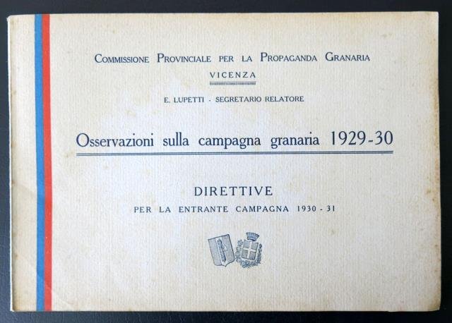 Commissione Provinciale per la Propaganda Granaria, Vicenza, 1930. In 8vo oblungo, pp. 75, ill. fot. in b/n, tavole sinottiche +1 cartina rip. in col., bross. orig. in carta con titoli in blu e due strisce in colore. Alcune macchioline del tempo ma buono stato.