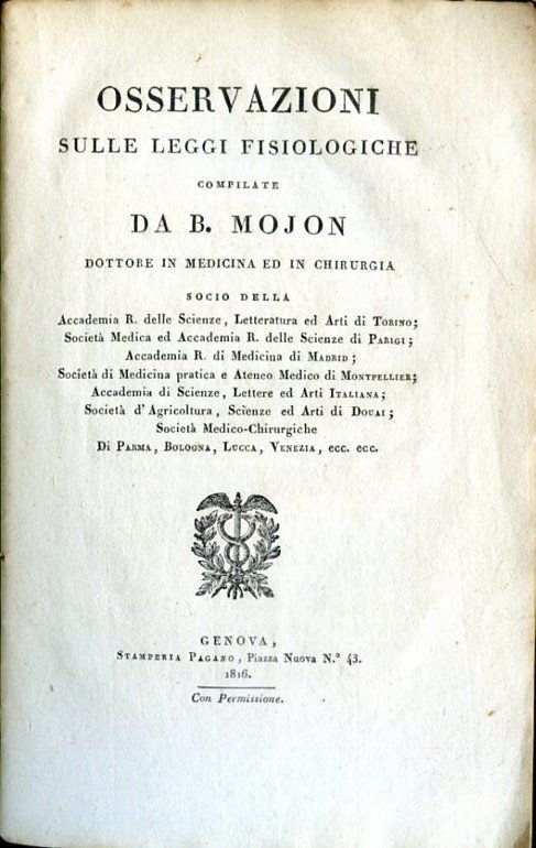 In-8°, pp. 31, brossura posteriore marmorizzata marrone. Prima e unica edizione, rara. L'opuscolo riprende e integra un precedente libro del Mojon del 1806, 'Leggi fisiologiche', rispondendo alle polemiche da esso sollevate. Il Mojon (Genova, 1784-ivi, 1849) fu professore di medicina a Genova e a Parigi e socio di numerosissime accademie medico-scientifiche. Cfr. Wellcome, IV, 149; Hirsch, IV, 231.