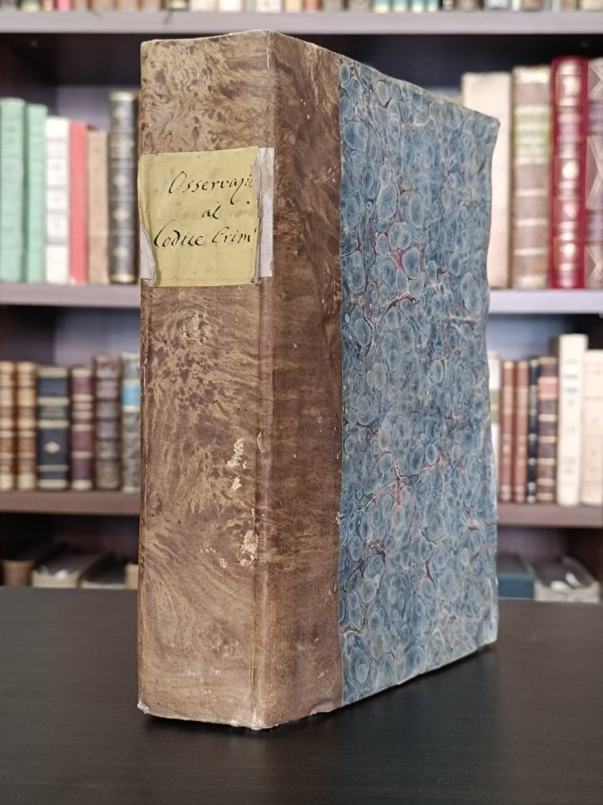 In-8° (cm. 23,8), gradevole legatura in cartonato coevo marmorizzato con titolo manoscritto su tassello al dorso; pp. [8] 629 [3] in barbe, in stato molto buono; lievi fioriture sparse, antica firma di possesso al contropiatto, volume parzialmente intonso. «Parte Prima» ma unica pubblicata. Edizione assai rara di questo interessante volume di diritto penale. Esemplare molto buono. (NA10)