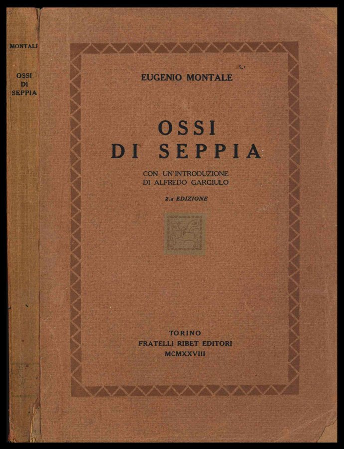 LIBROSeconda edizione modificata.Esemplare numero 356/450, in più che buone condizioni (piccole mancanze agli angolini anteriori integrate con carta simile; minima mancanza — senza perdite — al piede del dorso, con principio di separazione al taglio basso della cerniera anteriore; interno con la normale, leggera brunitura, ma pulito)Libro raro, tirato in soli 450 esemplari numerati nella bella collana diretta da Mario Gromo per le edizioni Ribet, oltre a 22 numerati con le lettere dell’alfabeto e pochi esemplari fuori serie riservati alla stampa (numerati oltre il 450). Come noto, Montale rimase assai poco soddisfatto dall’aspetto tipografico della pur gloriosa edizione originale degli «Ossi», pubblicata dal martire antifascista Piero Gobetti nel 1925. In una famosa lettera all’editore si legge il poeta lamentare la scarsa consistenza del libretto («. ti prego di far spazieggiare fino al possibile . Tanto non arriva alle 100 pagine neanche a largheggiare. Fa’ stampare in carta un po’ grossa .»). Nel formato adottato da Ribet, utilizzando finalmente una carta ‘un po’ grossa’, il libro assume in effetti un altro spessore. -- La seconda edizione degli «Ossi di seppia» è caratterizzata da importantissime varianti d’autore: contiene sei liriche in più rispetto alla prima edizione (Vento e bandiere, Fuscello teso al muro, I morti, Delta, Incontro, composte nel 1926; la notissima Arsenio, composta nel 1927); viene cassata la poesia «Musica sognante» e, soprattutto, i componimenti sono diversamente disposti nel libro, a modificare il senso complessivo della raccolta. -- Merita menzione, infine, la prefazione di Alfredo Gargiulo (1876-1949), filosofo crociano poi distaccatosi dal maestro e legatosi al circuito fiorentino delle riviste Voce-Solaria-Ronda: Gargiulo esaltava l’innegabile tono lirico (i.e. musicale) della raccolta, mantenuto nonostante la scelta di una poetica di grande modernità e anti-classica (motivo per il quale poi il critico napoletano non poté comprendere né approvare la svolta delle «Occasioni»).Barile, Bibliografia montaliana, A2