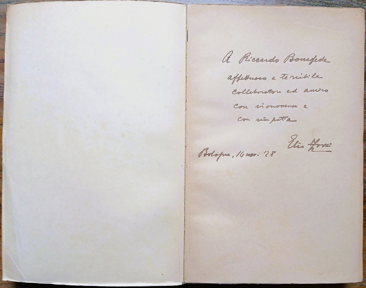 - Dedica autografa di Elio Zorzi al recto del foglio di guardia anteriore