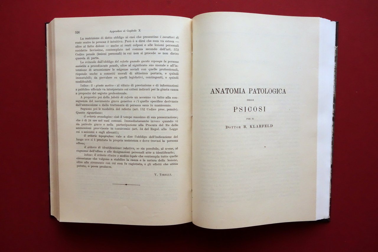 Oswald Bumke, Trattato di Psichiatria con una appendice sulla anatomia patologica delle psicosi del Dott. B. Klarfeld prima traduzione italiana sulla seconda edizione tedesca del Dott. Carlo Ferrero [.] volume primo con 195 figure nel testo Unione Tipografico - Editrice Torinese, Torino 1927; cm 24,5x17; pp. X-704 con 195 fig. in b/n nel t.; legatura d'epoca in mezza tela (dorso e angoli) con titolo impresso in oro al dorso, piatti marmorizzati. Alla seconda di copertina applicato bell'ex libris del precedente proprietario. Solo volume 1. Condizioni di conservazione Buone condizioni con leggere tracce d'uso; alla coperta solamente alcuni piccoli leggerissimi aloni per lo pi√π al dorso. Interni in condizioni pi√π che buone, ancora per lo pi√π freschi. Volume 1. SETT90.L26293 N