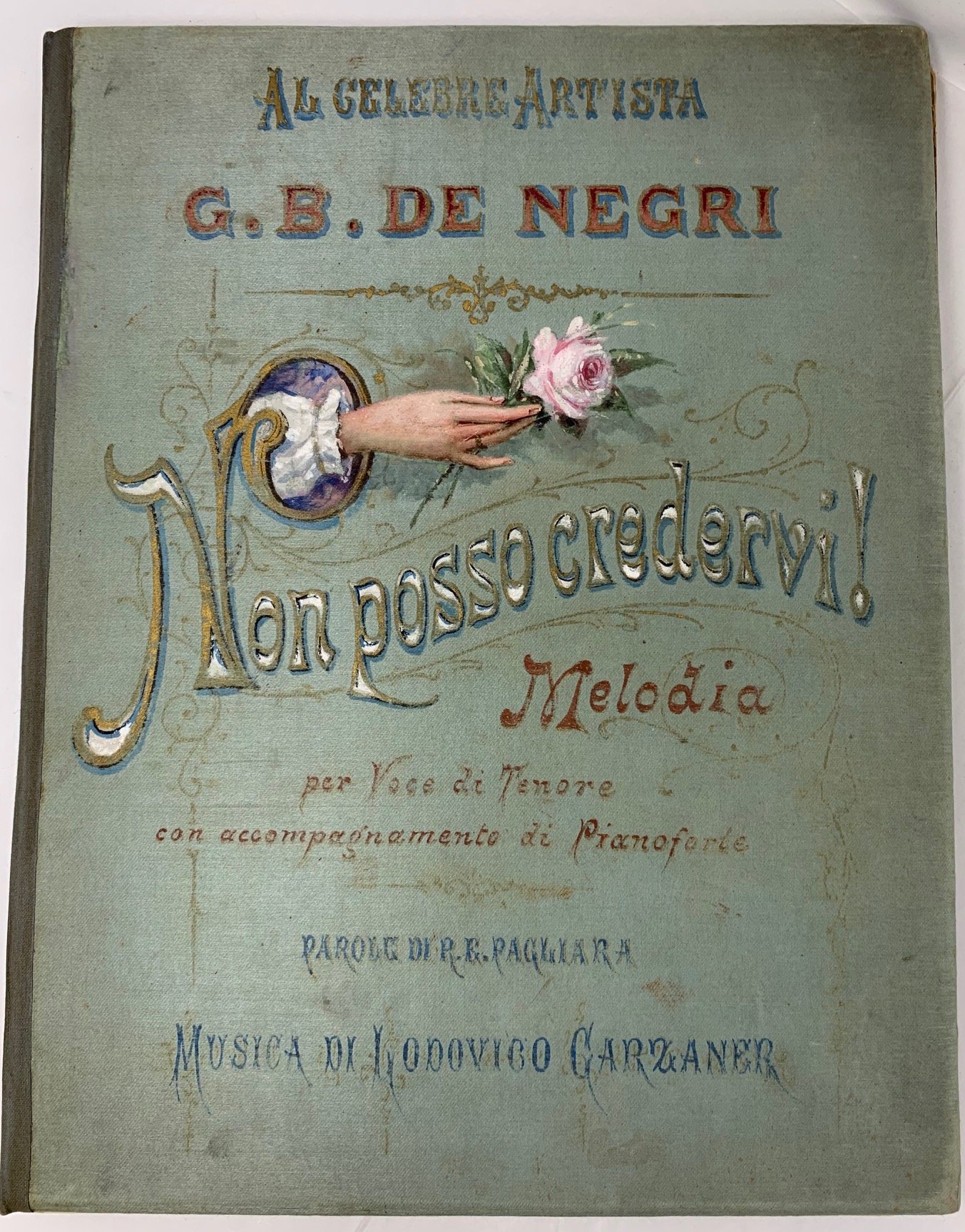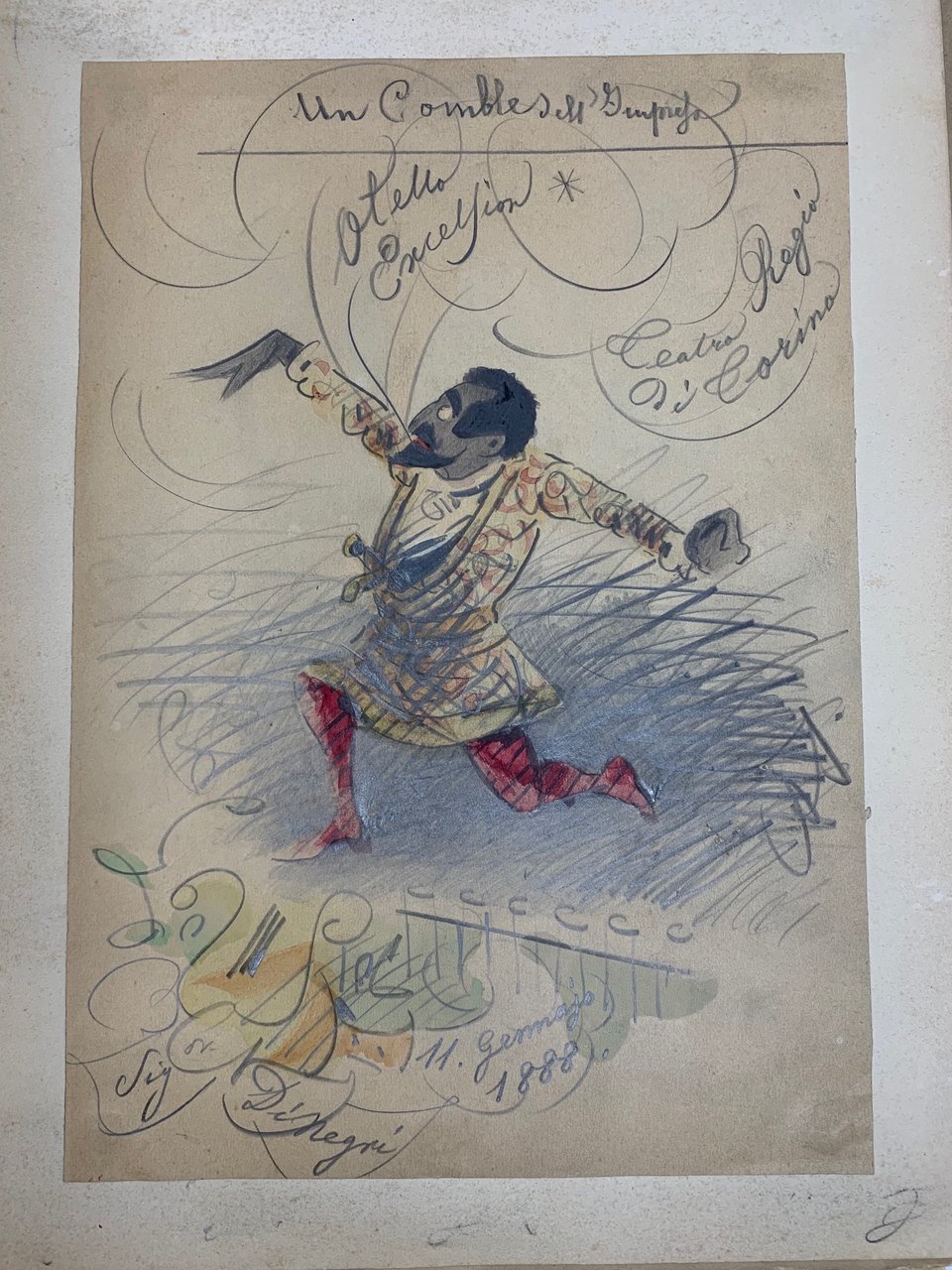 >Miscellanea dedicata al celebre tenore piemontese Giovanni Battista De Negri (Nizza Monferrato, 1850 – Torino, 1922). L'assieme comprende: 14 disegni a lapis ed acquarello raffiguranti caricature dell'Otello Verdiano interpretato dal celebre tenore e firmati Saletta. Un supplemento letterario al n. 57 del giornale ''L'avvenire della Provincia'' (di Alessandria, 1893), pp. 6, interamente dedicato all'Otello e al De Negri. 2 cartoline: 1 con il De Negri in costume di scena, l'altra con ritratto a mezzo busto del De Negri in alto a destra. Un contratto manoscritto dell'agenzia teatrale autorizzata ''Giuseppe Bergamin'', datato 8 Marzo 1895, tra Edoardo Sonzogno del Teatro alla Scala ed il Cav. G.B. De Negri per la parte di primo tenore per cantare nell'opera Ratcliff diretto dal Mascagni. Il tutto è conservato nella cartellina originale in seta dipinta, realizzata per il tenore in occasione dell'interpretazione dell'opera: "Non posso credervi!'' Le 14 caricature sono datate 1888 e firmate Saletta; misuramo mm. 275x192 sono tutte applicate su cartoncino di dimensioni maggiori. Augusto SALETTA, avvocato e disegnatore satirico collaborò, insieme ad Attilio Mussino e Luigi Sapelli alla redazione della nota rivista Il Fischietto. Importante testimonianza della grande voce piemontese; De Negri, dopo aver esordito a Bergamo in Poliuto di Donizetti, nell'ultimo ventennio dell'Ottocento si produsse nei maggiori teatri italiani, compiendo inoltre frequenti tournées in Europa e in Sudamerica. Evento importante nella sua carriera fu il trionfale debutto nel ruolo di Otello nel capolavoro verdiano al teatro Regio di Torino il 26 dic. 1887: il successo ottenuto fu tale che il D. interpretò il ruolo per ben ventiquattro rappresentazioni, alternandole con dodici di Aida, dopodiché fu Otello a Fermo, a Treviso, a Genova (1888), a Buenos Aires ed a Pietroburgo (1890). Il 15 genn. 1891 ebbe finalmente la sua consacrazione alla Scala nel Simon Boccanegra di Verdi, accanto ad A. Cattaneo e a M. Battistini, sotto la direzione di F. Faccio: la critica milanese, elogiando la sua prestazione evidenziò l'adesione delle qualità canore alle opere di Verdi (Corriere della sera, 16-17 genn. 1890). Verso la fine del 1894 ricevette da Mascagni la proposta di creare il ruolo del protagonista nella sua nuova opera Guglielmo Ratcliff; dopo iniziali indecisioni per l'estrema difficoltà della parte, affrontò lo spartito e nel giro di pochi giorni fu in grado di debuttare alla Scala sotto la direzione dello stesso Mascagni, accanto a D. Rogers, A. Stehele e G. Pacini (17 febbr. 1895); alla prima erano presenti Puccini, Franchetti, Gomes, Giacosa ed E. Praga.
