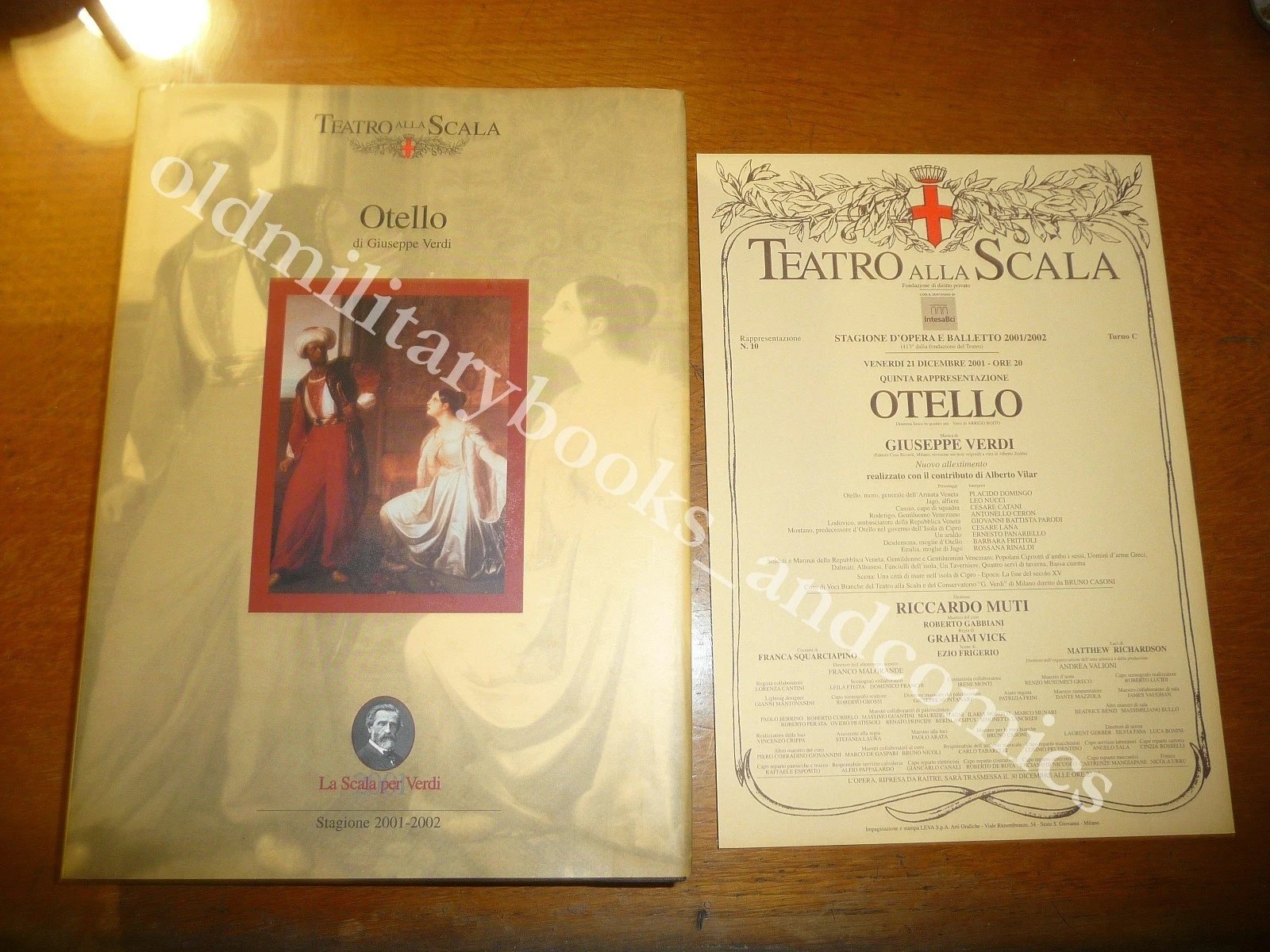 Il libro contiene: Otello (il libretto); Il Soggetto (cinque lingue italiano, francese, inglese, tedesco e giapponese); descrizione dell’Opera in breve a cura di Claudio Toscani; musica, dramma e dramma lirico a cura di James Hepokoski; una rilettura critica dell’Otello a cura di Alberto Zedda; attorno ai poemi sinfonici di Giuseppe Verdi a cura di Marco Grondona; l’Otello di Verdi alla Scala e studio critico a cura di A. Galli e F. Busoni; Francesco Tamagno: ricordi della sua vita ed aneddoti interessanti a cura di Edmondo De Amicis; Otello: le metamorfosi, nell’arte, in caricatura; con Otello cinquant’anni di Sant’Ambrogio a cura di Andrea Vitalini; Otello alla Scala dal 1887 al 1987; Giuseppe Verdi: bibliografia essenziale, cronologia della vita e delle opere; Discografia. Mantiene copia della Locandina dell’Otello per la serata di inaugurazione della stagione d’Opera e Balletto 2001-2002.